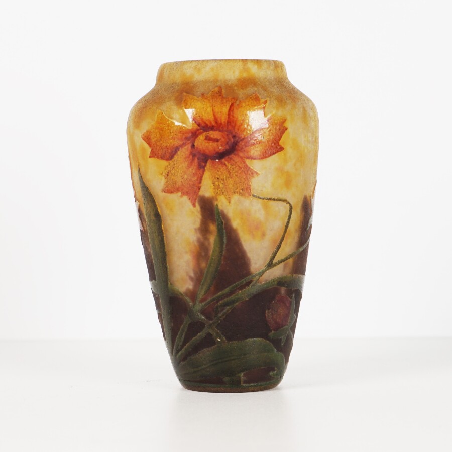 DAUM NANCY : Petit vase en verre soufflé à décor émaillé de fleurs jaunes et tiges vertes sur fond nuancé jaune-brun, signé dans le décor à la croix de Lorraine, H. 12 cm (très bel état).