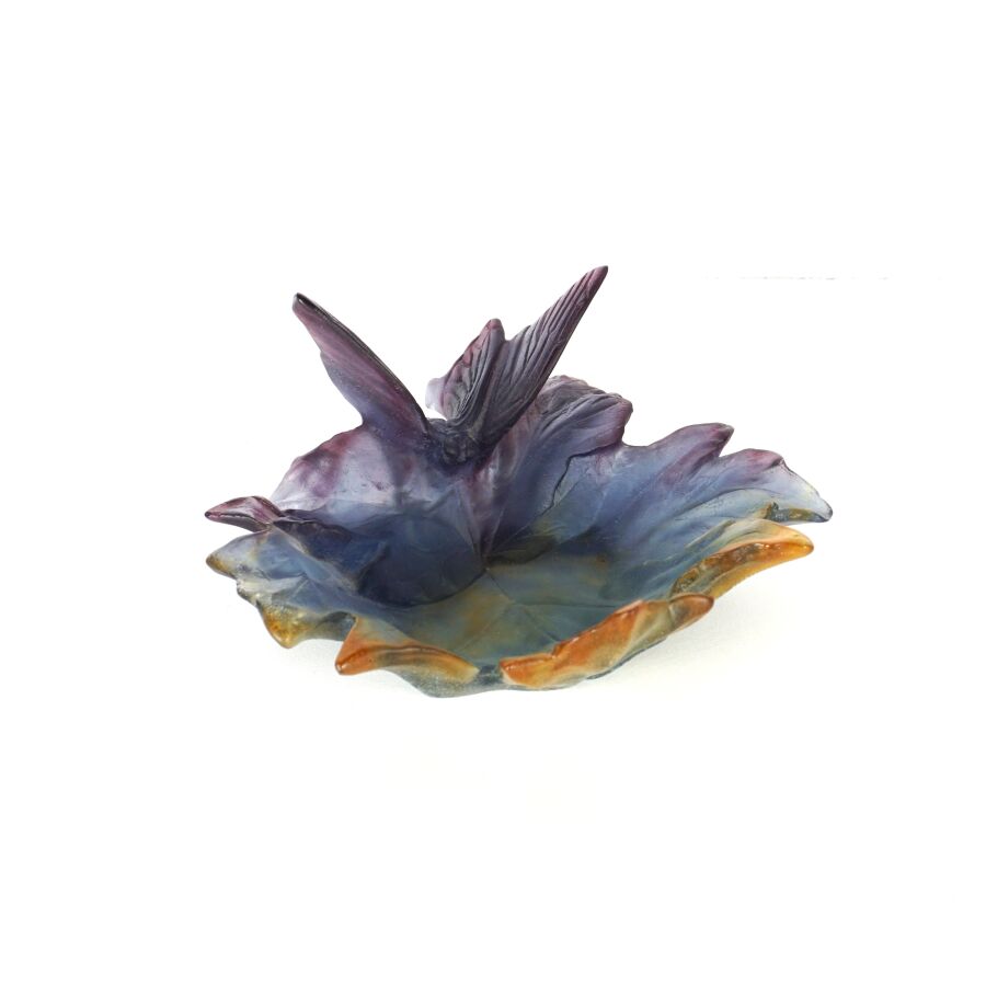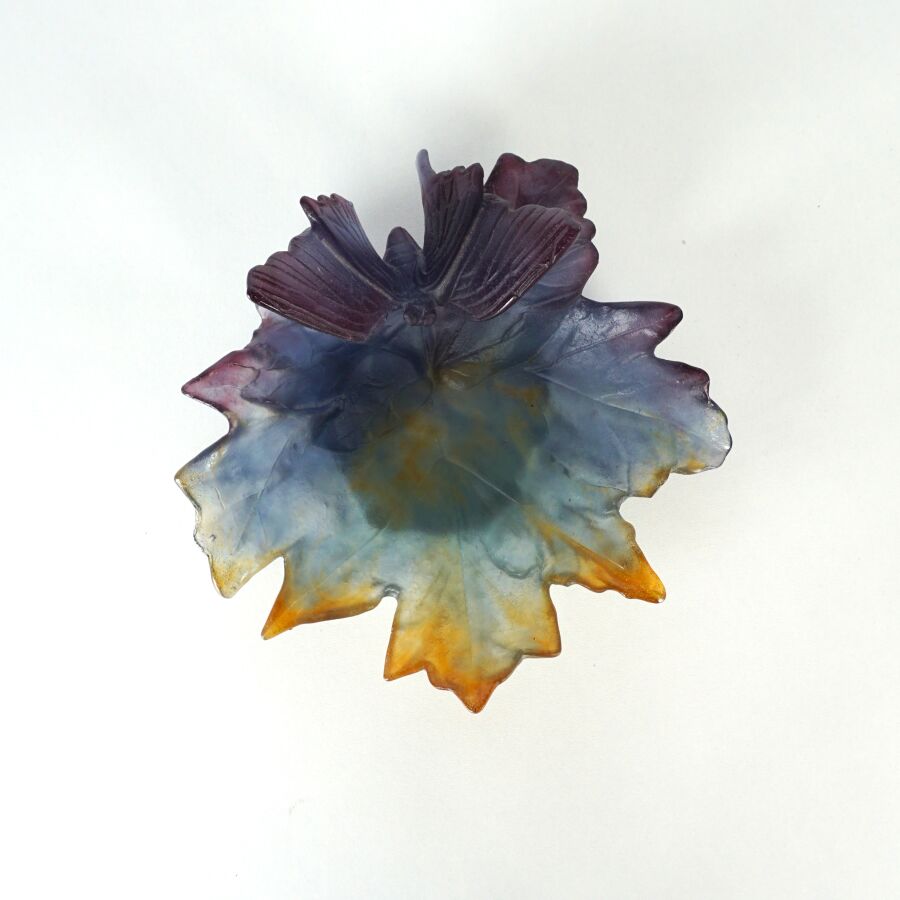 DAUM : Vide-poche en pâte de verre à motif d'un papillon posé sur une feuille, signé en creux, L. 17.2 cm. H. 8.5 cm.