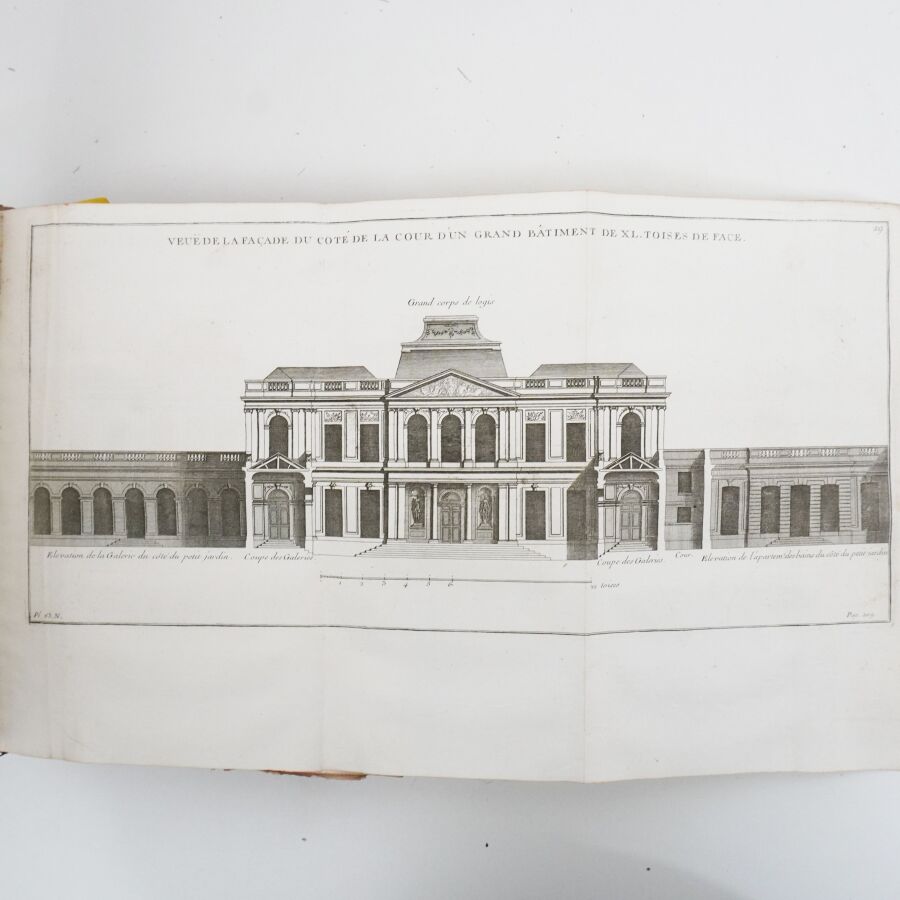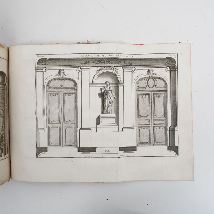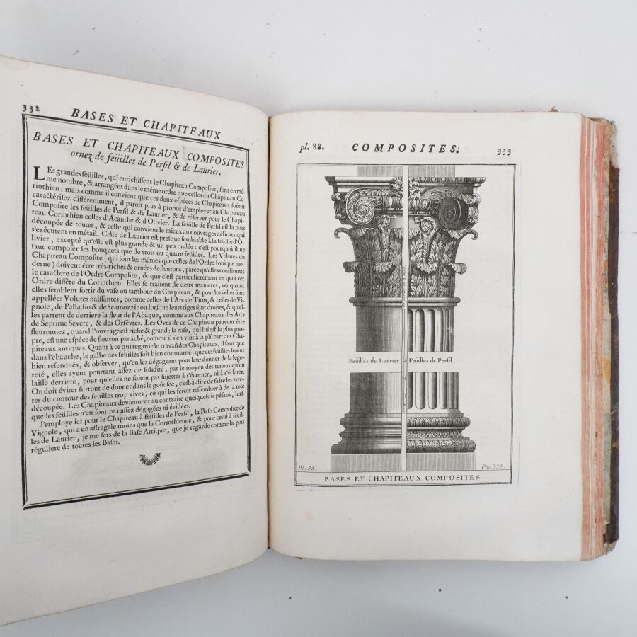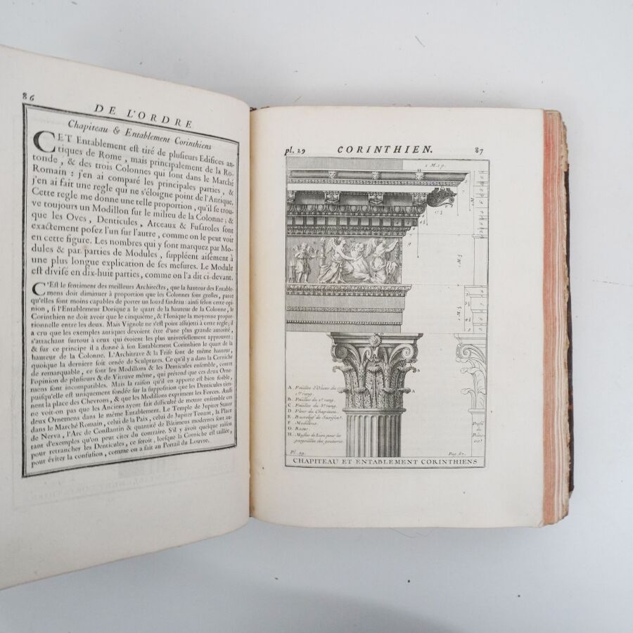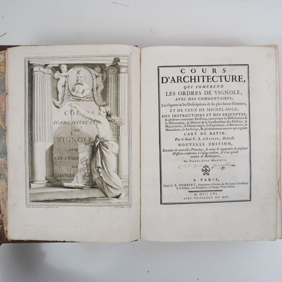D'AVILER (Augustin-Charles). Cours d'architecture, qui comprend les ordres de Vignole, avec les commentaires; les figures & les descriptions de ses plus beaux bâtimens, et de ceux de Michel-Ange; des instructions et des préceptes & plusieurs nouveaux desseins, concernant la distribution & la décoration, la matière & la construction des édifices, la maçonnerie, la charpenterie, la couverture, la serrurerie, la menuiserie, le jardinage & généralement tout ce qui regarde l'art de bâtir. Paris, Jombert, 1756. In-4, veau marbré, dos à nerfs orné, pièce de titre, tranches rouges (reliure de l'époque). Nouvelle édition enrichie de nouvelles planches, revue et augmentée par Pierre-Jean MARIETTE.