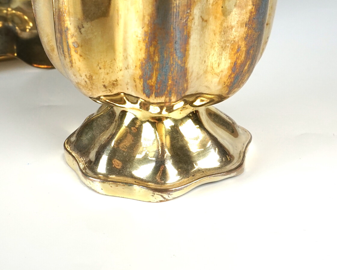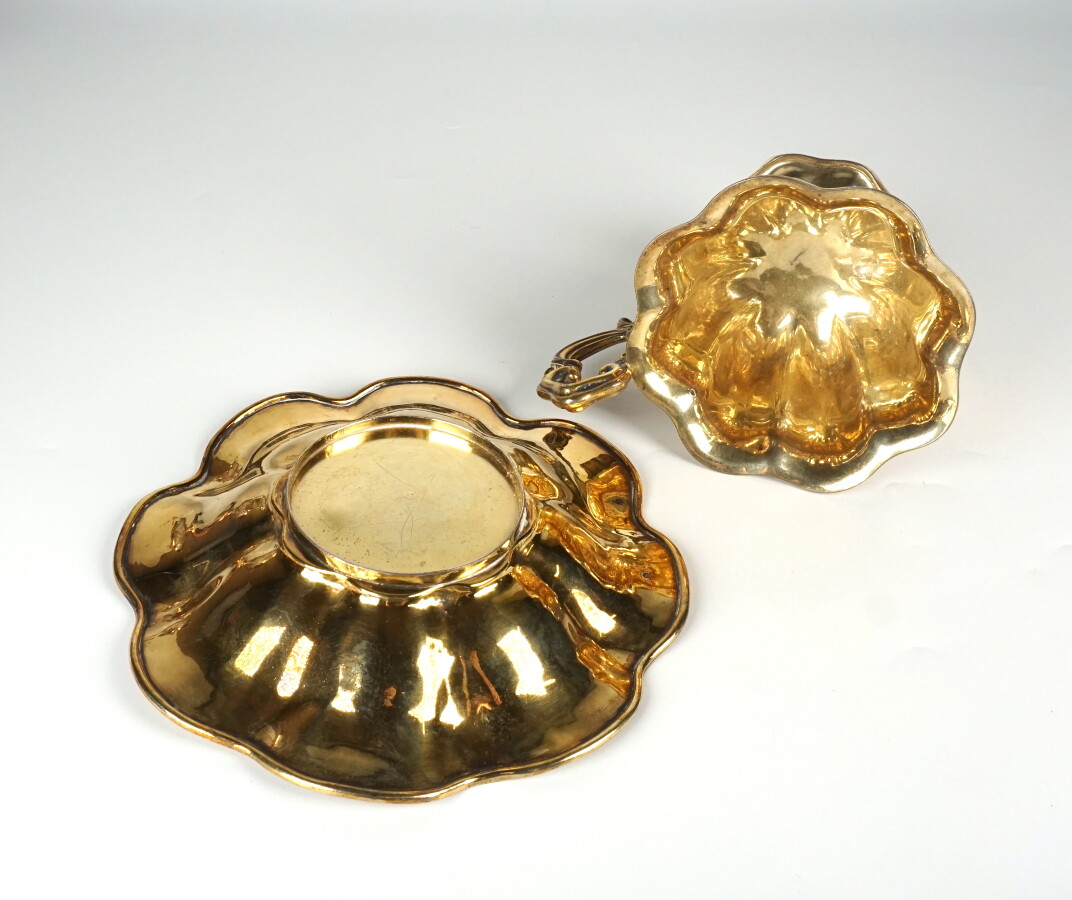 DEBAIN : Grande et jolie tasse sur piédouche et sa sous-tasse en vermeil, poinçon Minerve 1er titre, modèle floriforme, l'anse feuillagée, H. tasse : 11 cm, D. sous-tasse : 17 cm. Poids brut : 264 g environ.