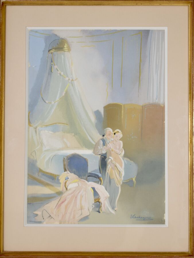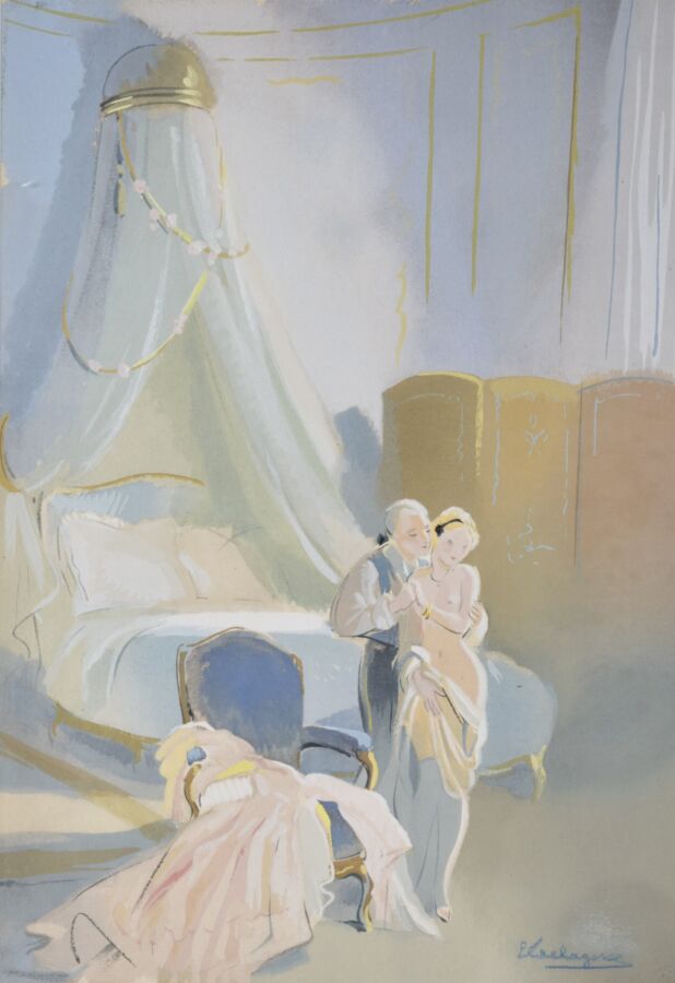 DELAGOSSE, "Scène galante dans la chambre à coucher", dessin au pastel réhaussé à l'aquarelle, signé en bas à gauche, 37.5 x 26 cm.