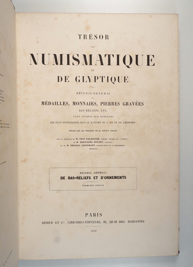DELAROCHE (Paul) - DUPONT (Henriquel) - LENORMANT (Charles) - Trésor de numismatique et de glyptique ou recueil général de médailles, monnaies, pierres gravées [] Recueil général des bas-reliefs et d'ornements - Paris ; Didier et Cie, 1858 - 2 parties en 2 volumes In-folio - Des rousseurs éparses, parfois prononcées aux feuillets de texte - 100 planches en noir in fine réparties dans les 2 volumes - Reliure de l'époque demi-toile noire - Dos titrés, tomés et ornés or.
