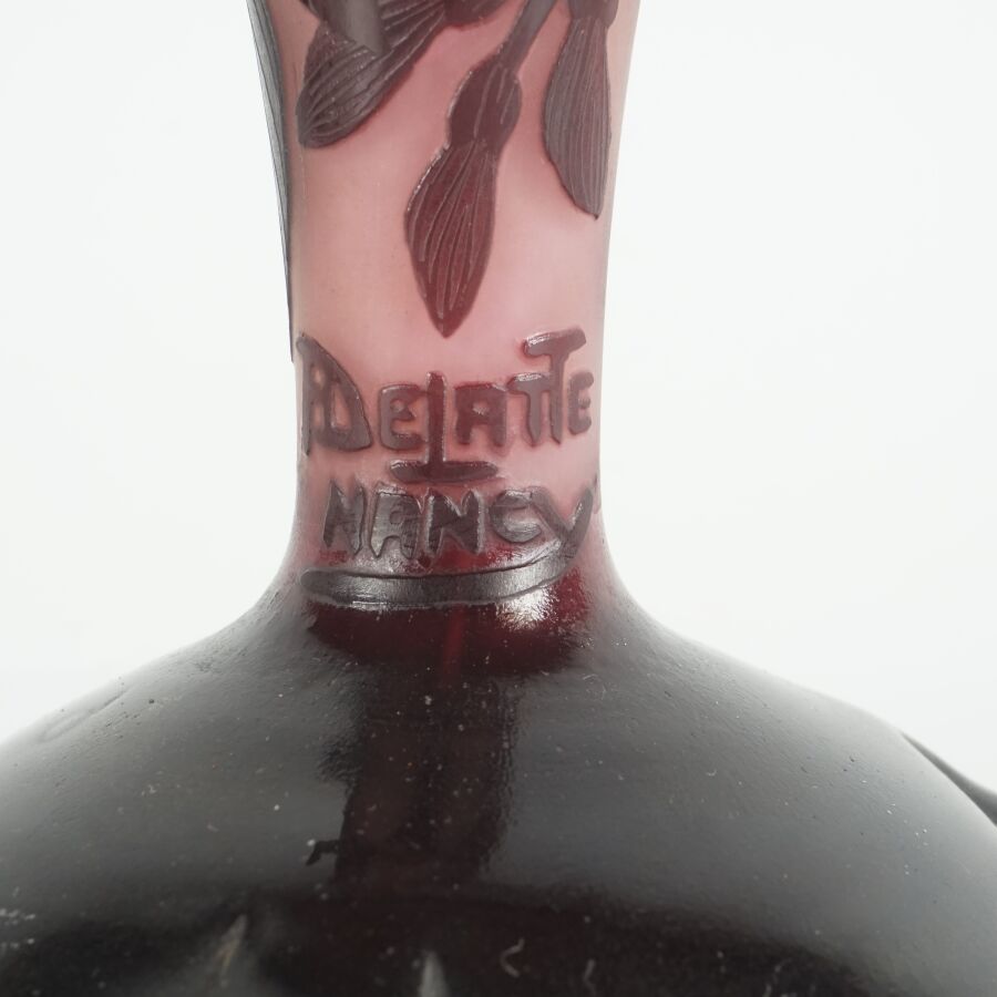 DELATTE NANCY : Pied de lampe en verre soufflé multicouche à décor dégagé à l'acide de végétaux bruns sur fond rose, signature en camée, monture en fer à décor art Déco, H. 25 cm (sans abat-jour).