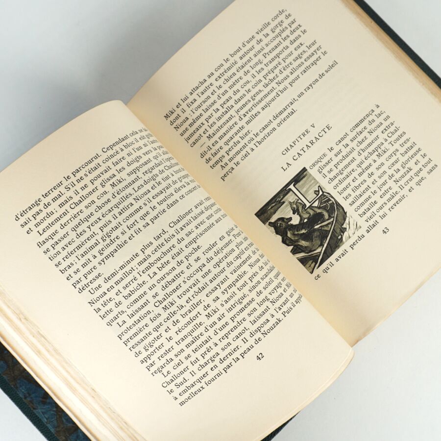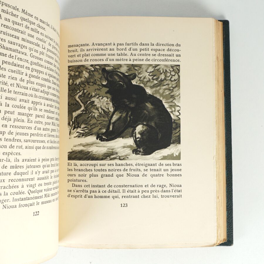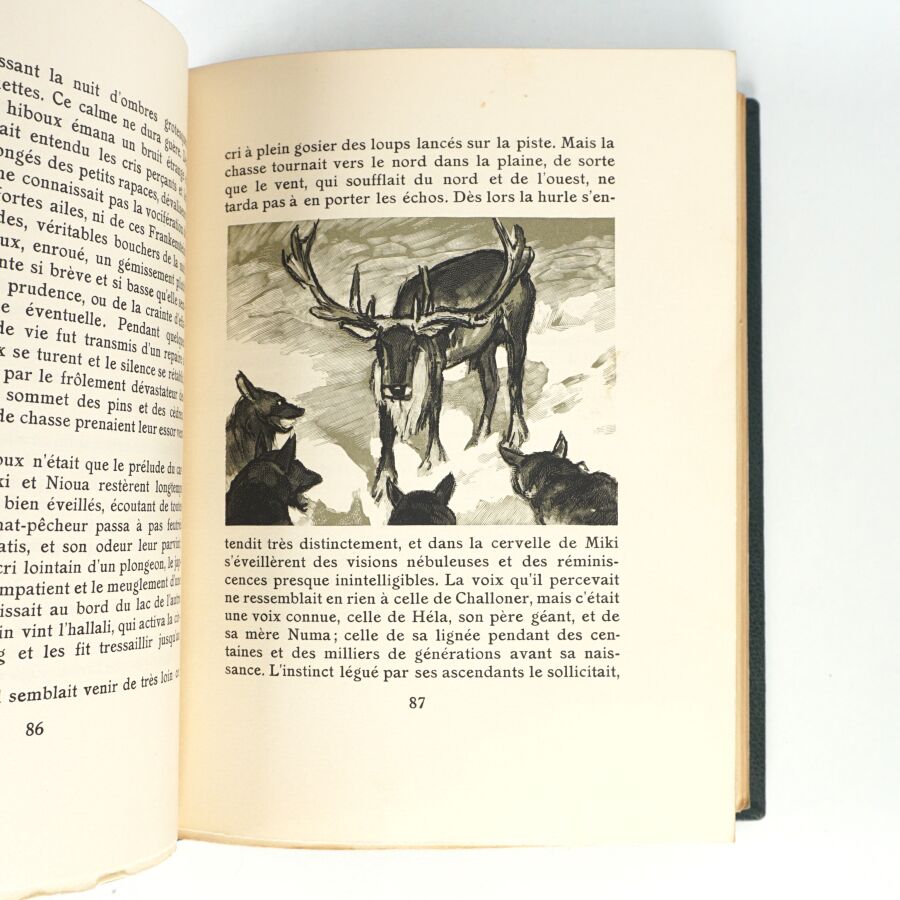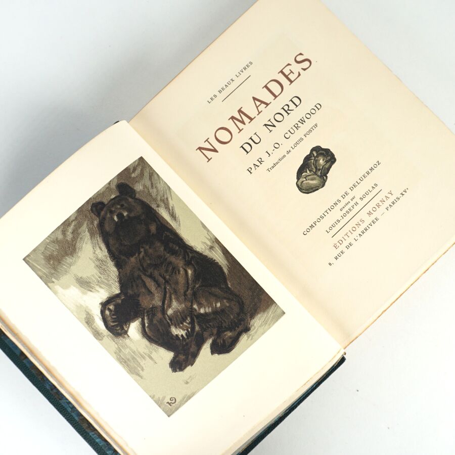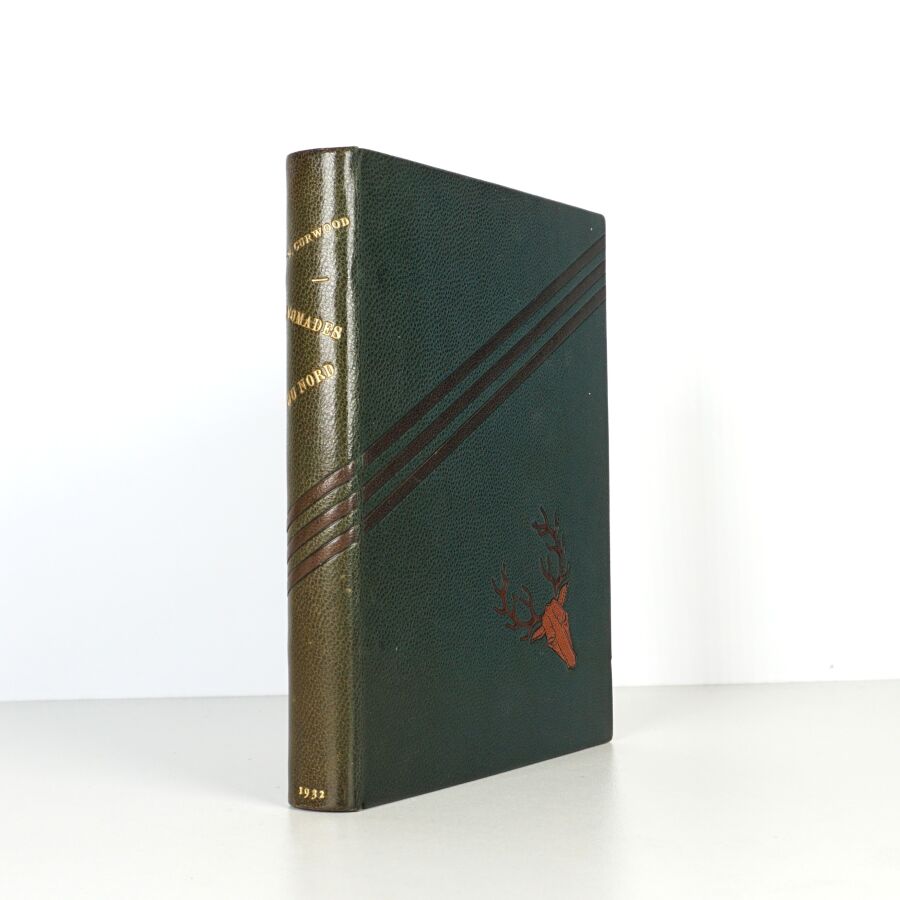 DELUERMOZ (Henri) & CURWOOD (J.-O.). Nomades du Nord. Traduction de Louis POSTIF. Paris, Mornay, 1932. In-8 chagrin vert, dos lisse, titre doré, composition de triple listel de maroquin brun et tête de cervidé mosaïquée au plat, couv. et dos conservés.