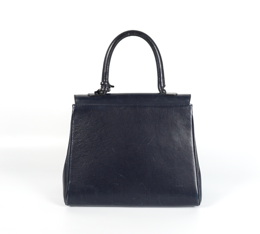 DELVAUX : Sac à main "Le Brillant" en cuir bleu, fermeture à rabat finissant par une grande boucle en métal doré signée, 30 x 24 cm. Présenté avec son dustbag (légères usures d'usage, griffures au niveau de la anse).