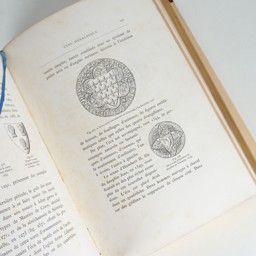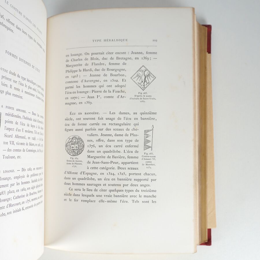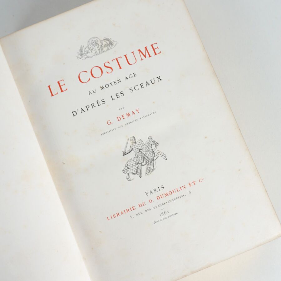 DEMAY (G.). Le Costume au Moyen Âge d'après les sceaux. Paris, Dumoulin et cie, 1880. In-4 demi-chagrin rouge à coins, dos à nerfs orné, titre doré, décor or et noir sur les plats et au dos (reliure de l'éditeur). Un coin appuyé, qqs petits frottés, très lég. rousseurs éparses.