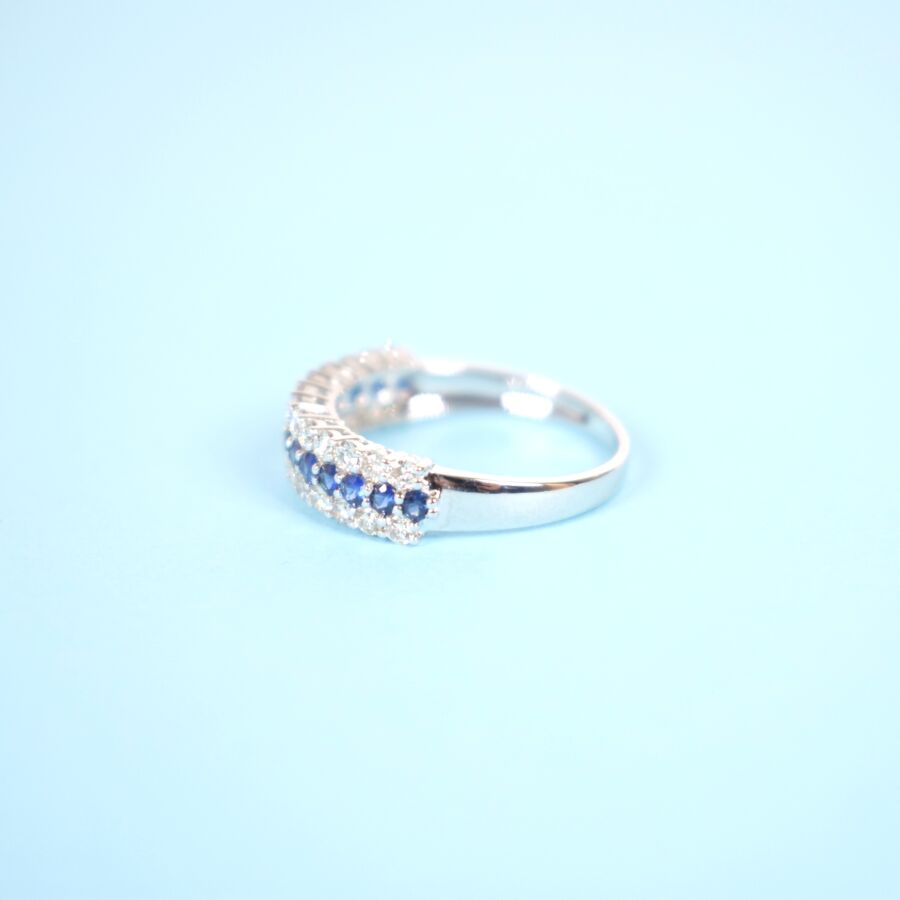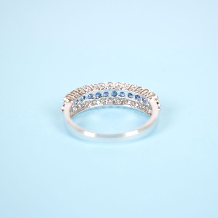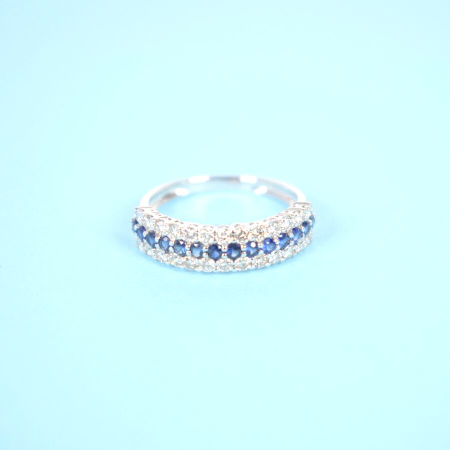 Demi-Alliance en or blanc 18K (750/oo) sertie d'une ligne de 14 saphirs ronds pour environ 0.4 ct entre deux lignes de 26 diamants blancs taille moderne pour environ 0.6 ct. TDD : 54. Dim. de la bague : 5 x 20 mm. Poids brut : 2.55 g.