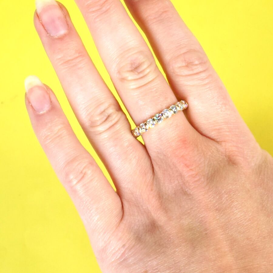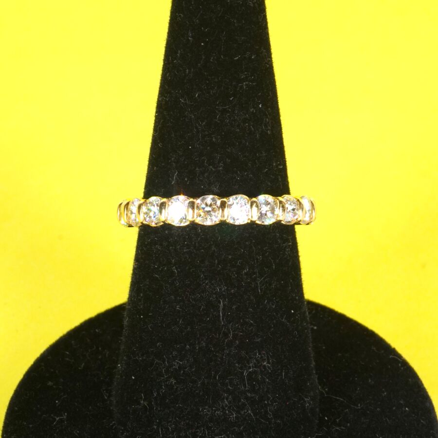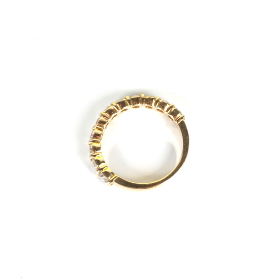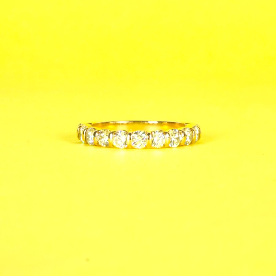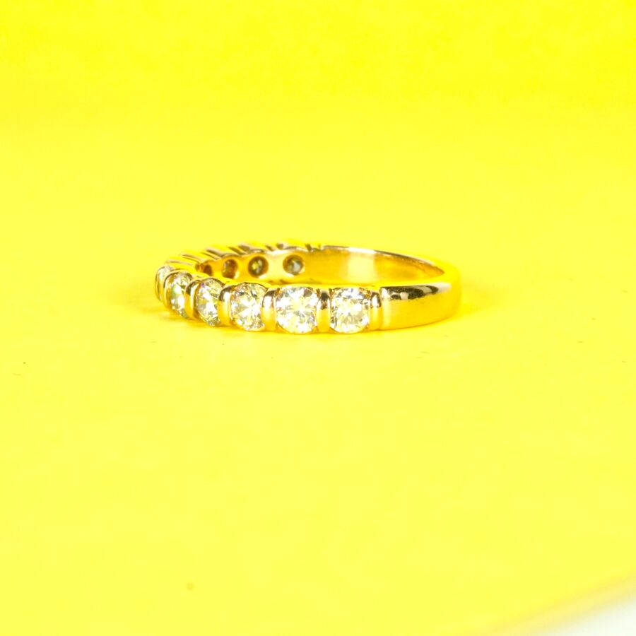 Demi alliance en or jaune 18K (750/oo) sertie de 11 diamants taille brillant calibrant au total 1.7 cts (D. 3.2 mm chaque environ), TDD. 58.5/59. Poids brut : 4.8 g environ.
