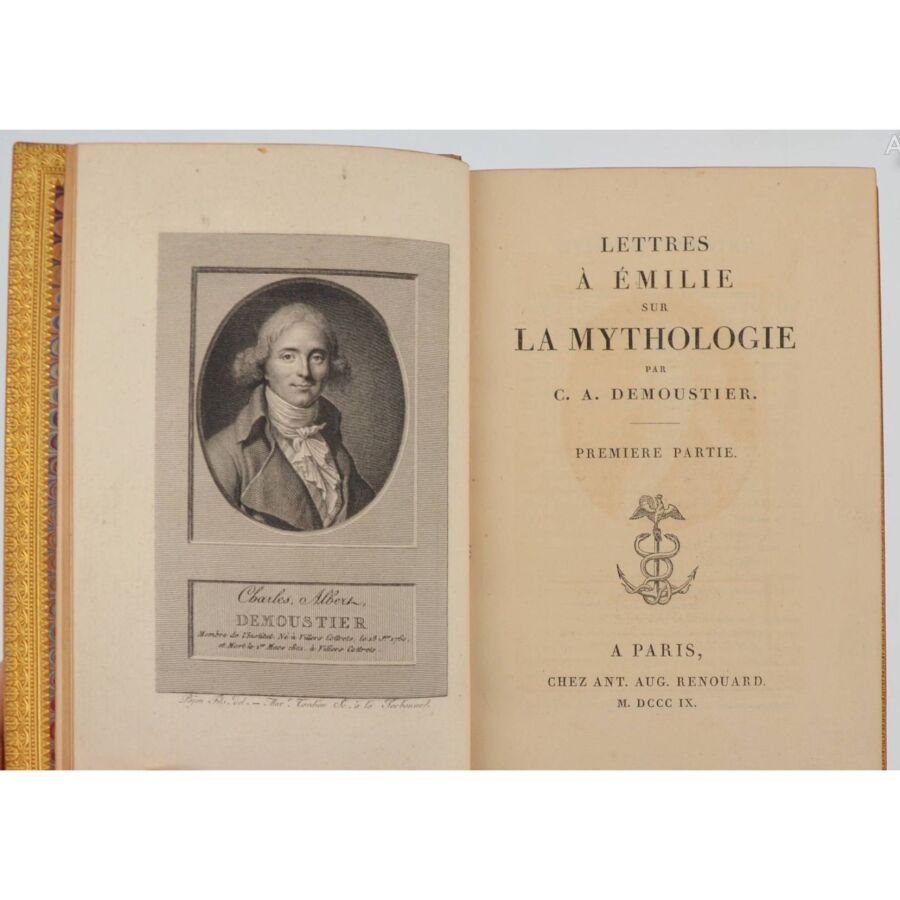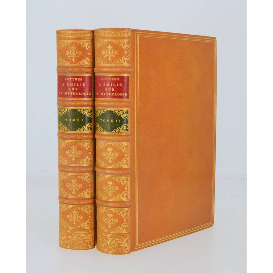 DEMOUSTIER (Charles Albert). Lettres à Emilie sur la mythologie. Paris, Renouard, 1809. 6 parties en 2 vol. in-8, maroquin citron, dos à nerfs richement ornés, triple filet doré encadrant les plats, double filet doré sur les coupes, large dentelle intérieure dorée, tr. dorées (Cuzin). L'illustration se compose d'un portrait-frontispice par Pajou fils, gravé par Tardieu, et de 36 figures de Moreau, gravées par Delvaux, Ghendt, Roger, Simonet, Thomas et Trière.