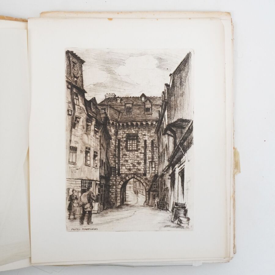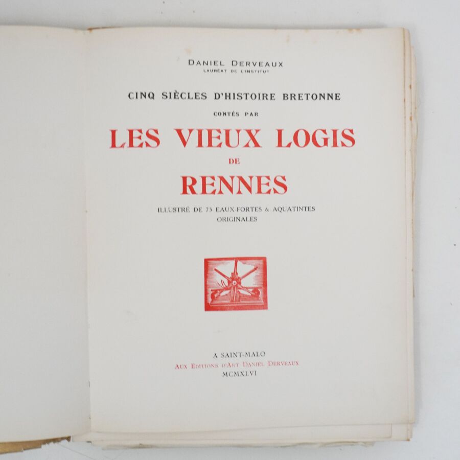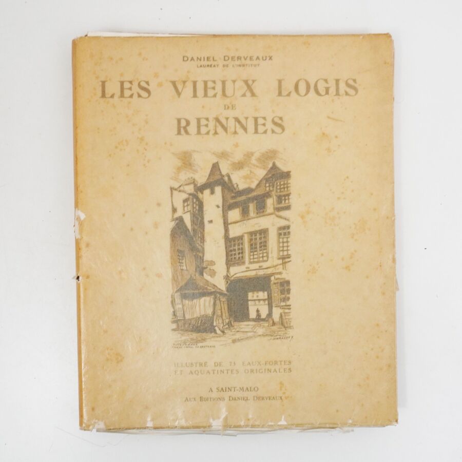 DERVEAUX (Daniel). Cinq siècles d'histoire bretonne contés par les vieux logis de Rennes. Illustré de 73 eaux-fortes et aquatintes originales. Saint-Malo, Daniel Derveaux, 1946. In-4 en ff., couv. imprimée rempliée (piquée, déchirures au dos).