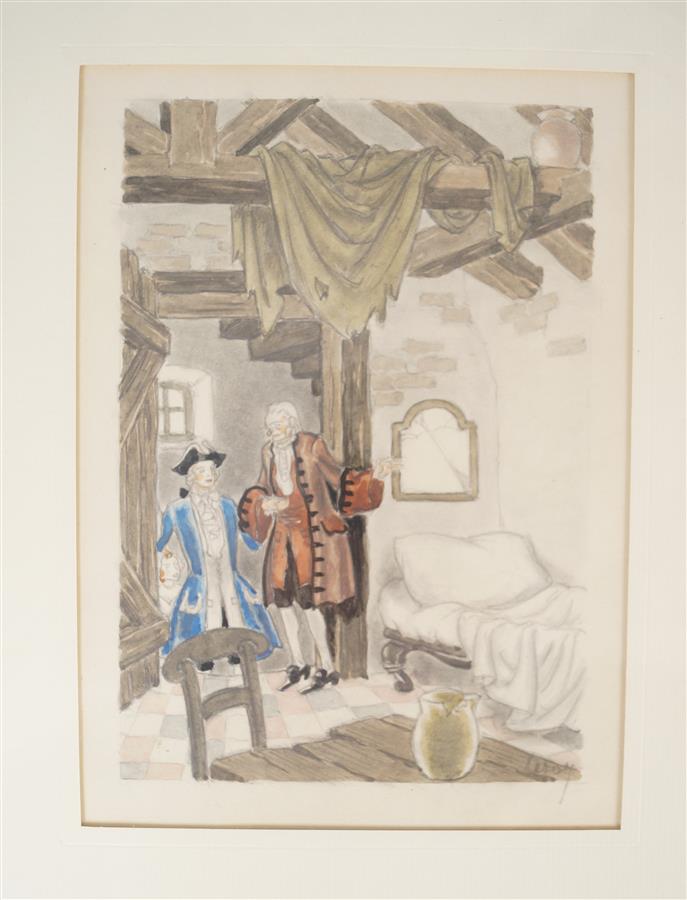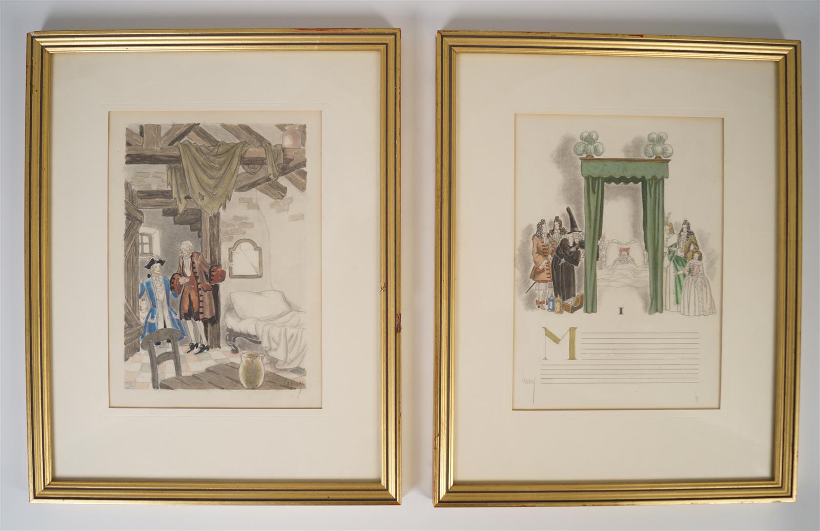[DESSIN] - LEROY (Maurice) - 1885-1973 - 2 aquarelles originales, signées au crayon, ayant servies à illustrer, l'une, Le malade imaginaire de Molière, l'autre, Les liaisons dangereuses de Choderlos de Laclos - 18 x 13 cm (à vue) - Encadrées sous verre.