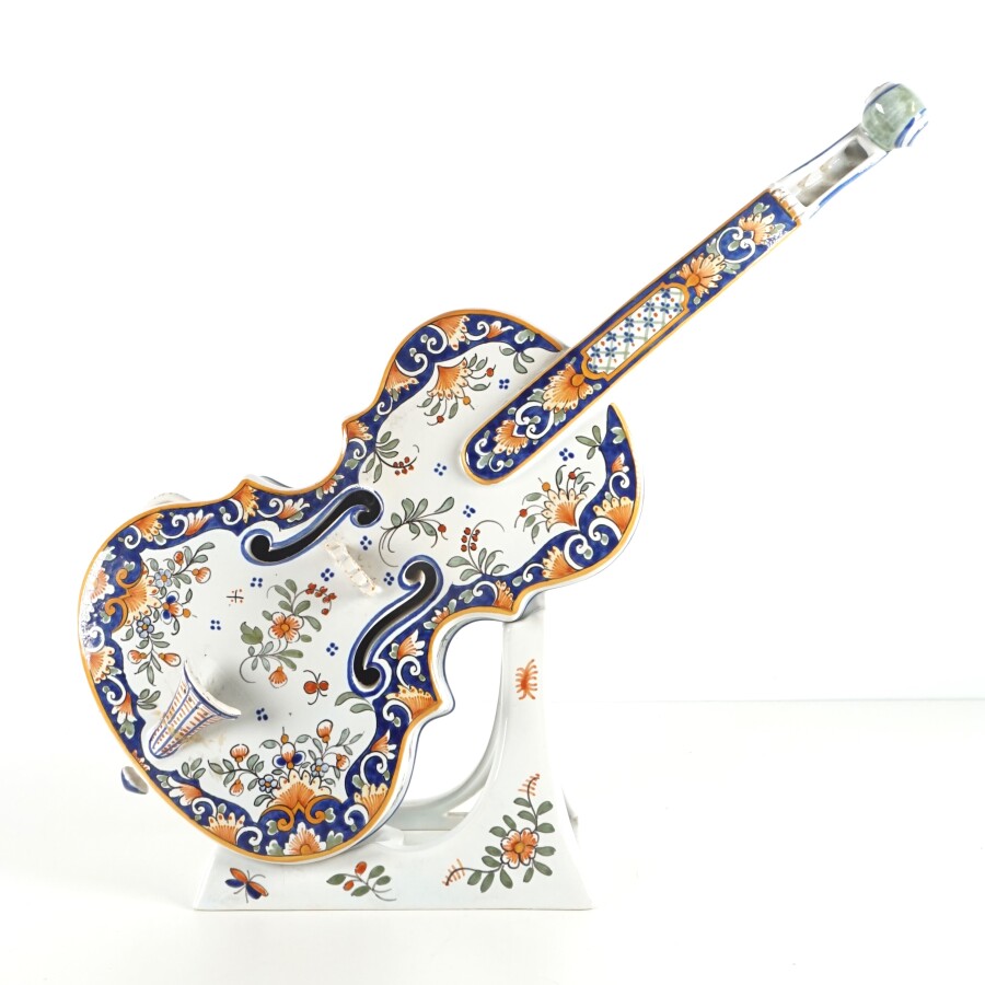 DESVRES : Violon en faïence émaillée polychrome, à décor de grand feu composé de fleurs, présenté sur son socle, marqué d'un tampon et porte la mention "Décor - Rouen, fait-main", L. 48 violon.
