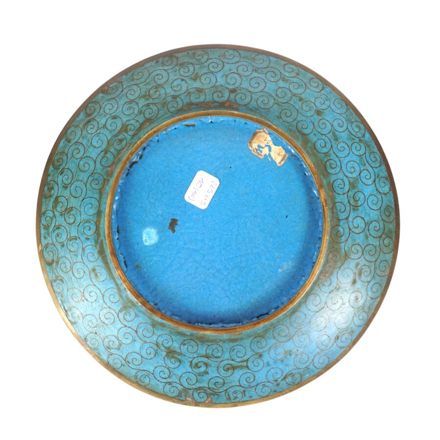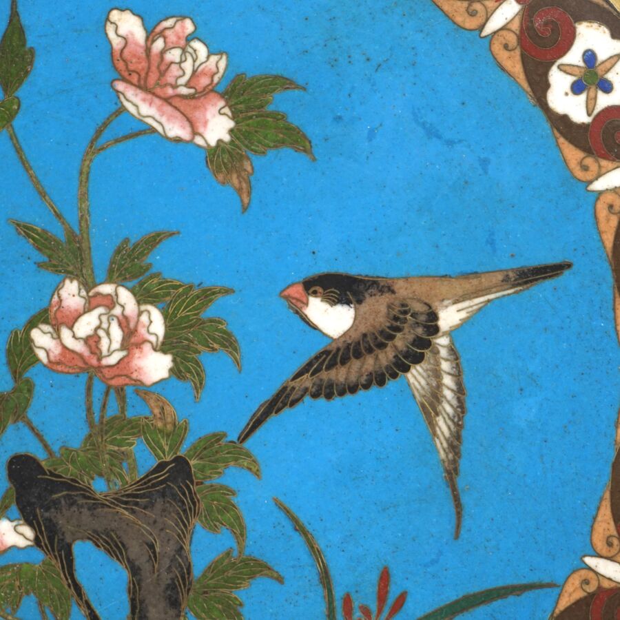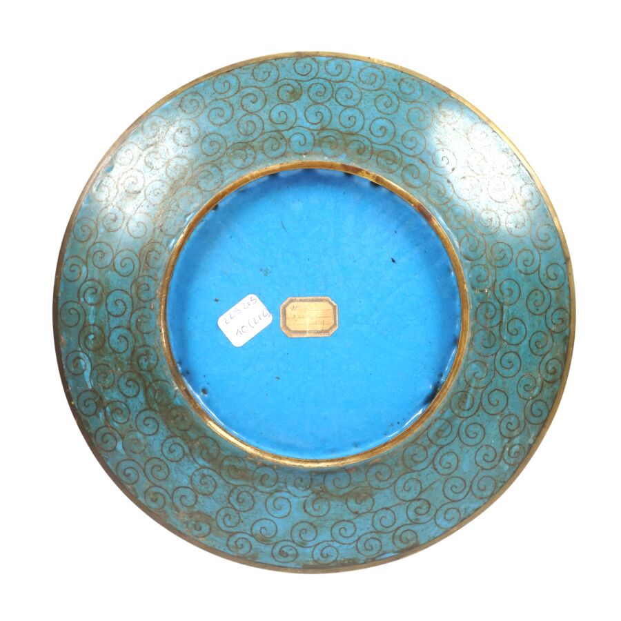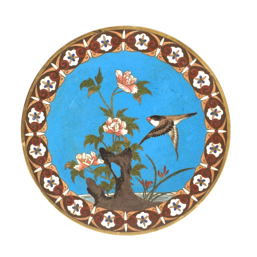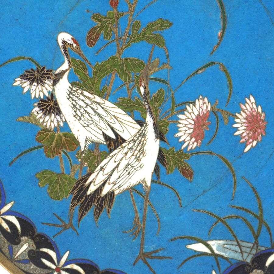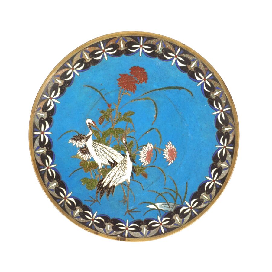 Deux assiettes en métal et émaux cloisonnés sur cuivre à décor polychrome d'un couple d'échassiers et d'un volatile branché, Japon, circa 1900, Diam. 24.4 cm et 24.5 cm.