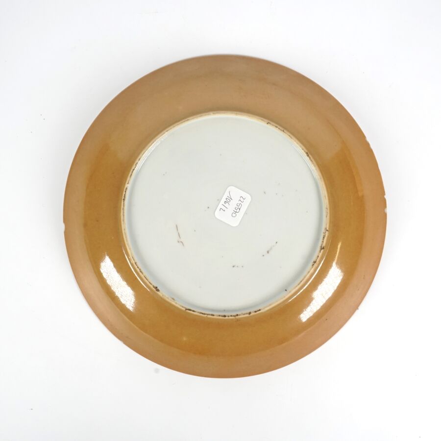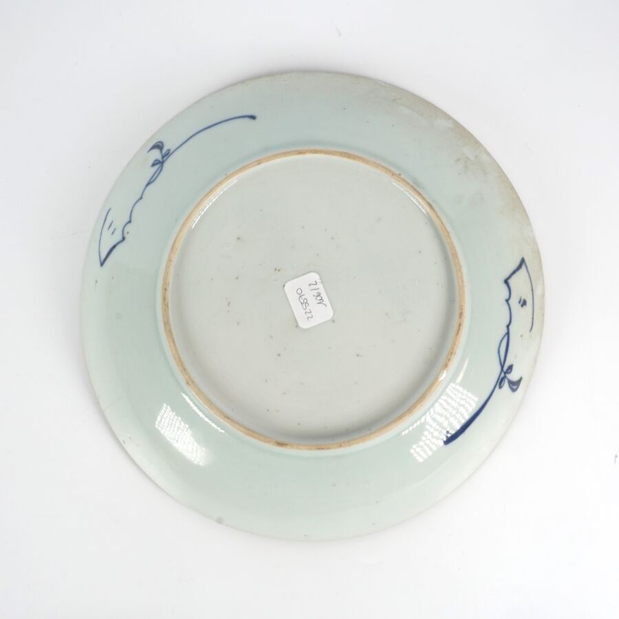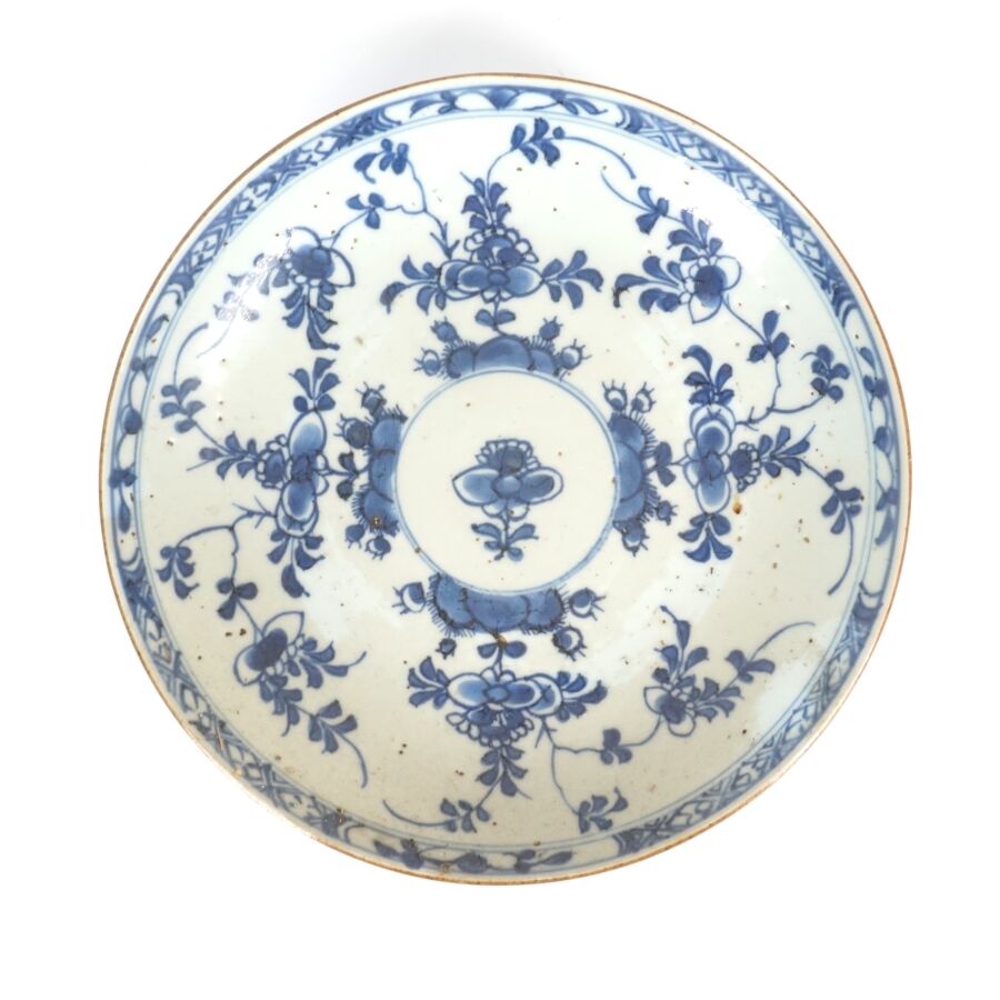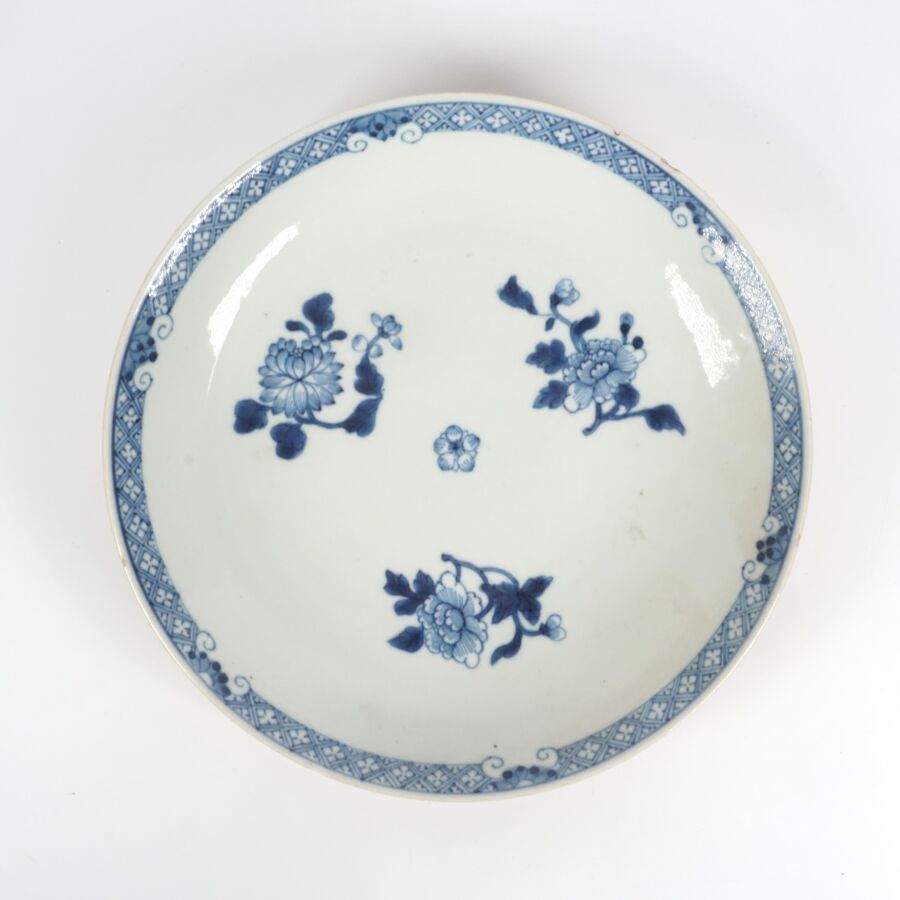 Deux assiettes en porcelaine émaillée bleu blanc à décor de fleurs, le revers de l'une émaillée capucin, Compagnie des Indes, Chine, 18ème siècle, D. 21.4 cm et 22.2 cm (égrenures, défauts de cuisson et infimes éclats).