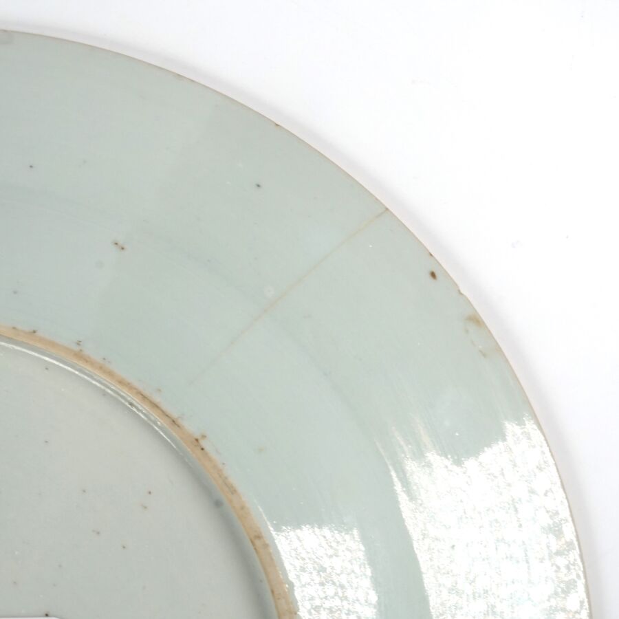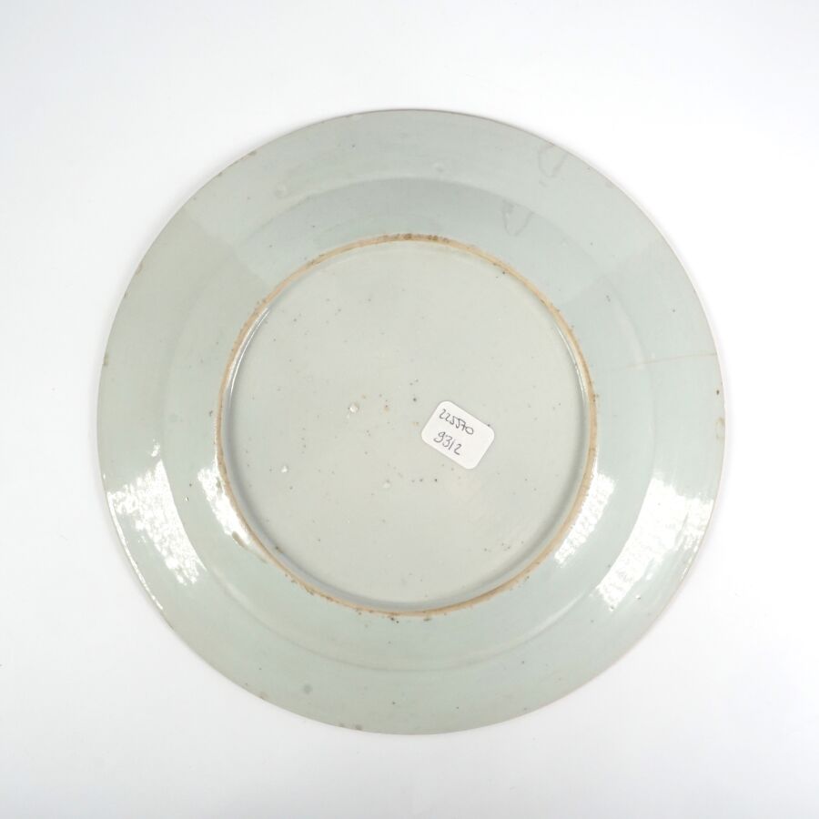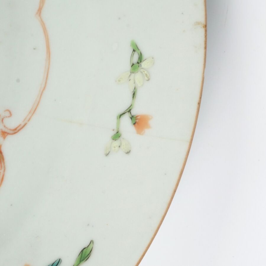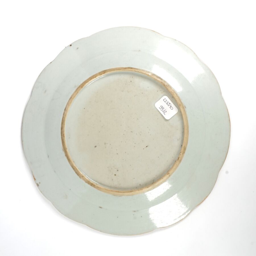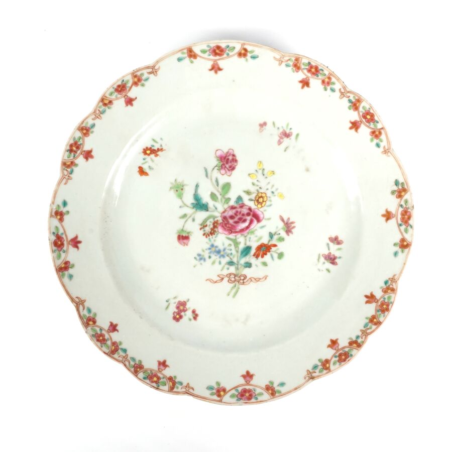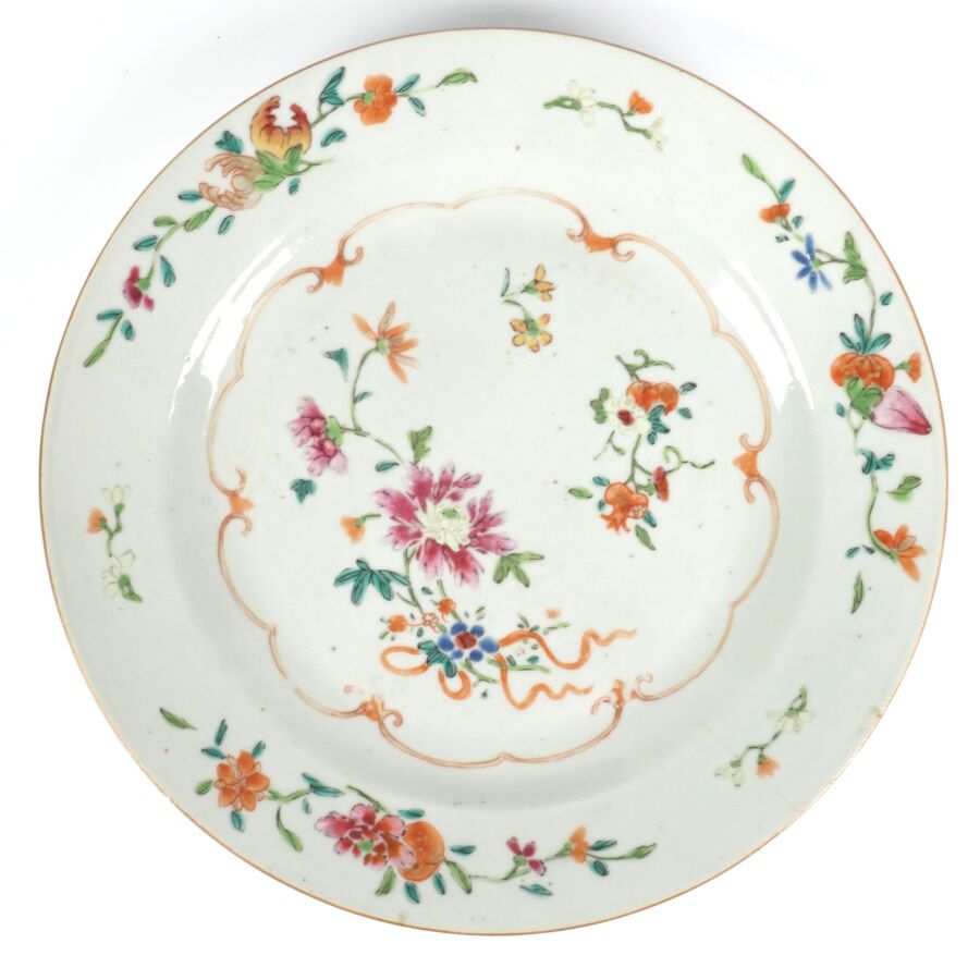 Deux assiettes en porcelaine et émaux de la famille rose à décor de chrysanthèmes et de fleurs, l'aile bordée d'une guirlande florale pour l'une et de pêches pour la seconde, Compagnie des Indes, Chine, 18ème siècle, D. 22.5 cm et 22.6 cm (petit fêle à l'une, quelques légers éclats en bordure pour la seconde).