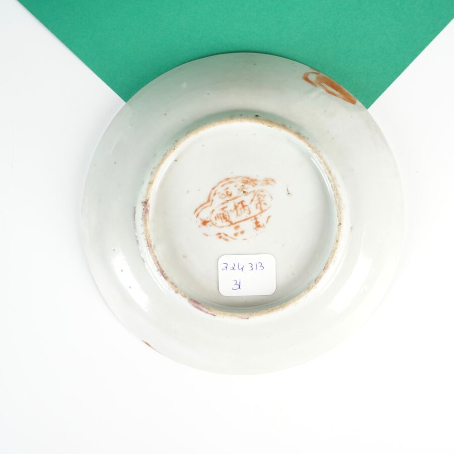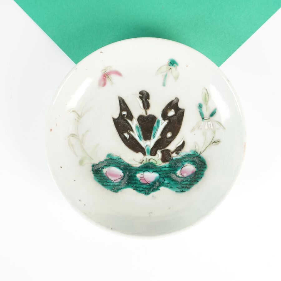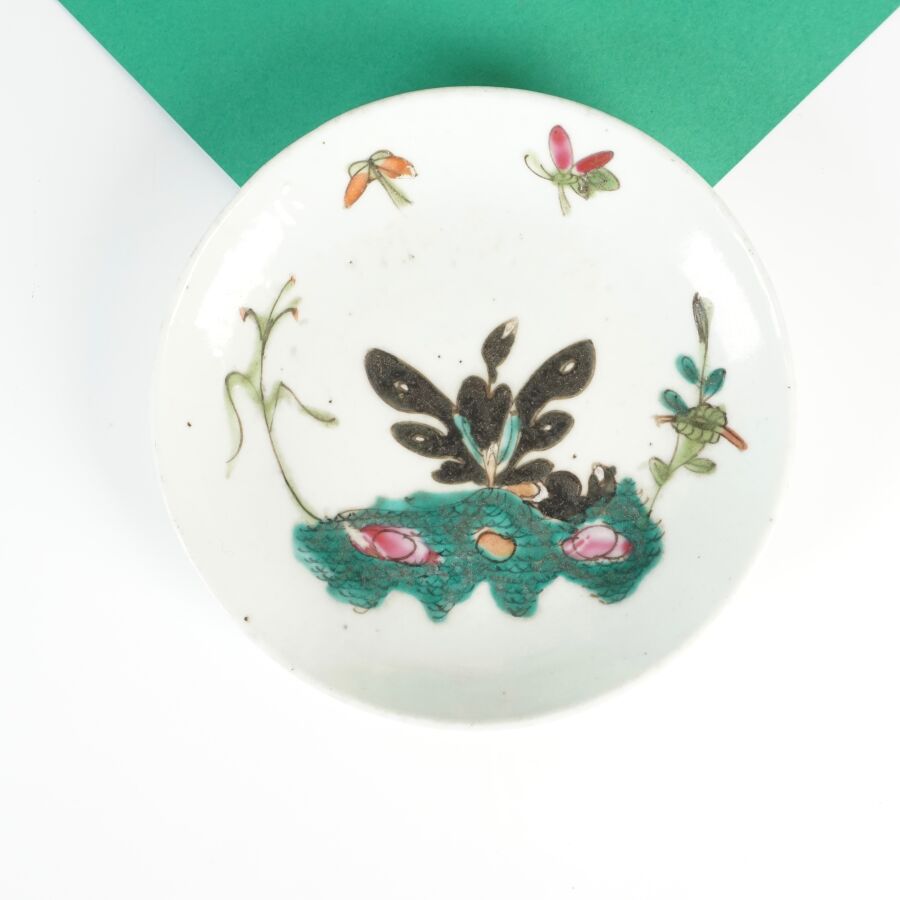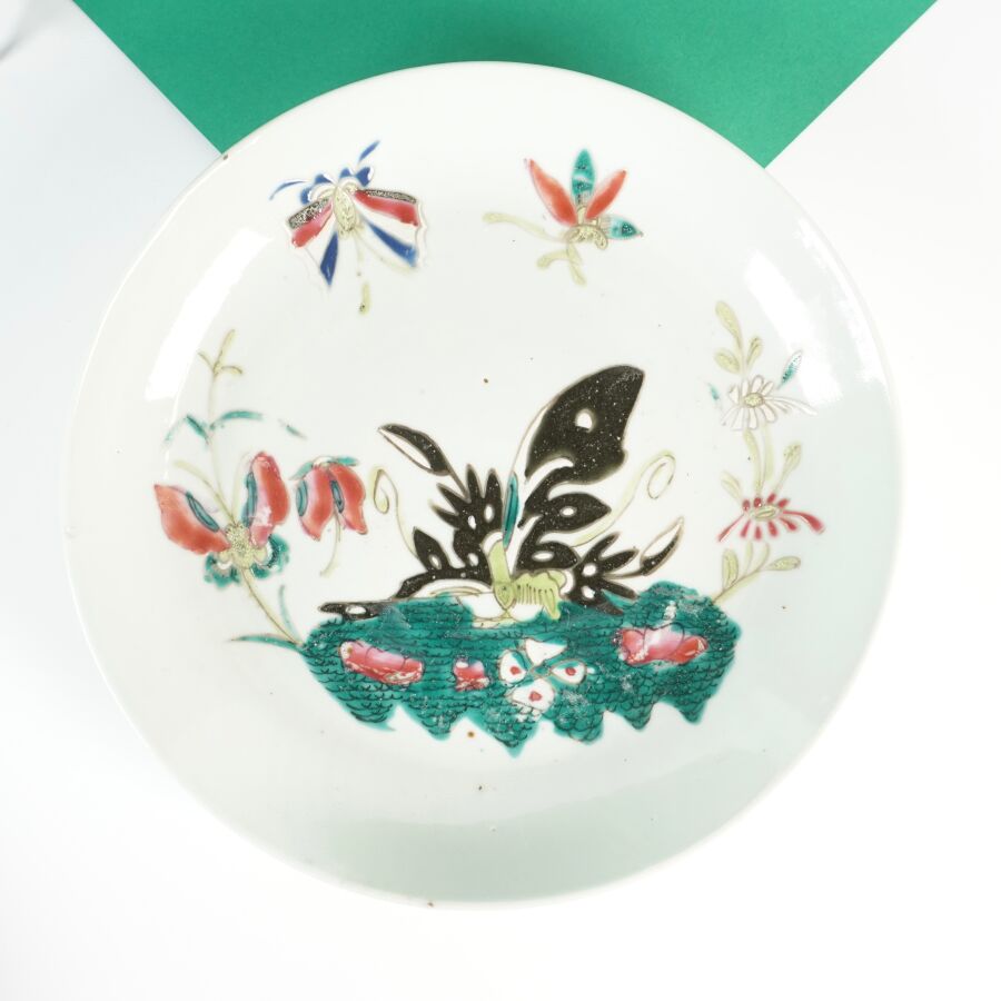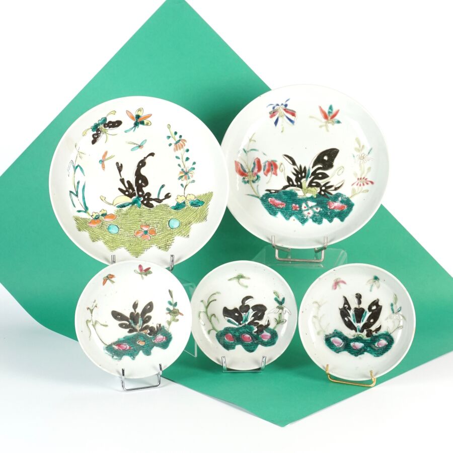 Deux assiettes et trois coupelles en porcelaine et émaux de style famille rose à décor de plantes aquatiques et papillons, début du 20ème siècle, Chine, D. 13 cm et 22.5 cm.