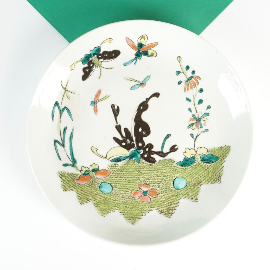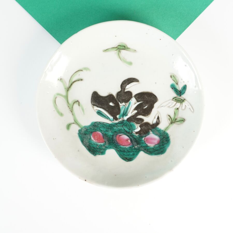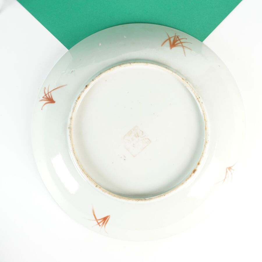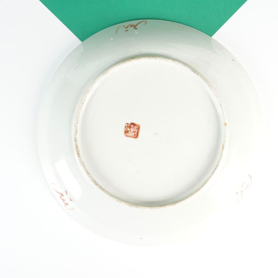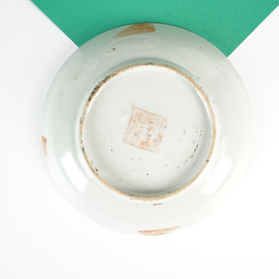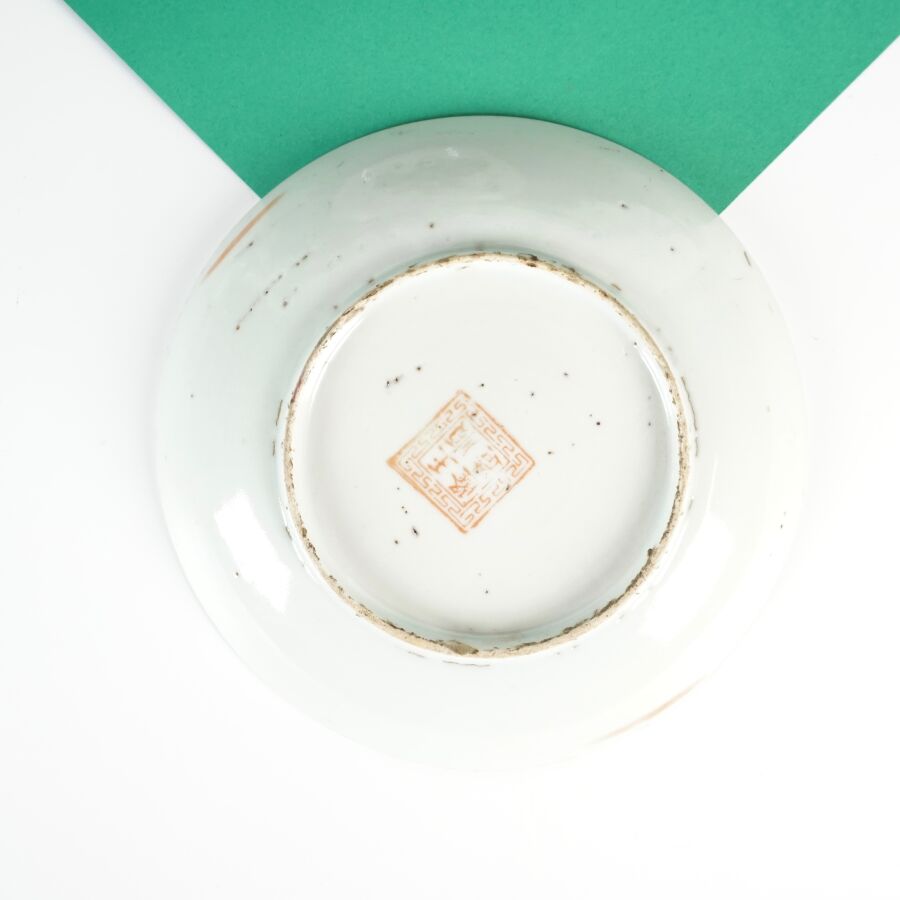 Deux assiettes et trois coupelles en porcelaine et émaux de style famille rose à décor de plantes aquatiques et papillons, début du 20ème siècle, Chine, D. 13 cm et 22.5 cm.