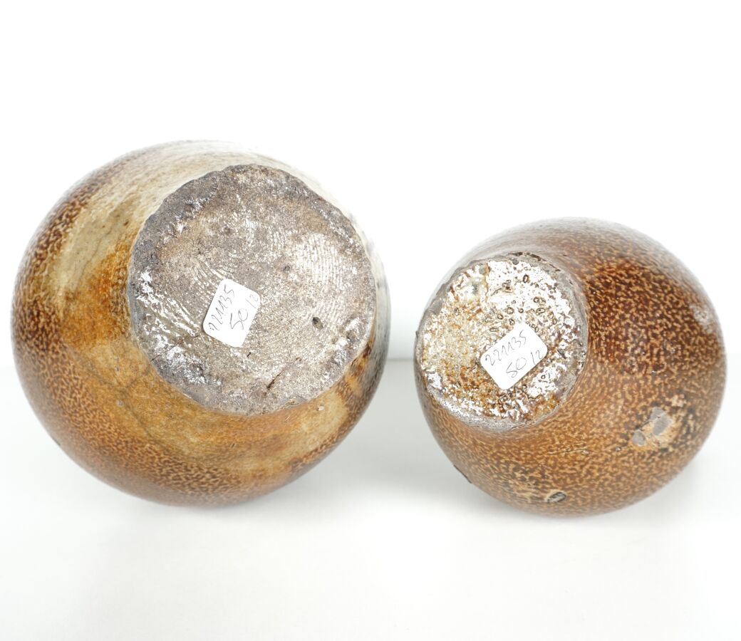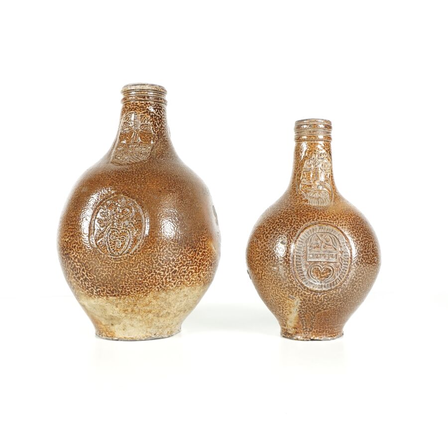 Deux bouteilles en grès émaillé à une anse au col, décor pastillé de portrait d'homme barbu, de médaillons au coeur et à motifs d'inspiration populaire, travail populaire de la fin du 18ème siècle, H. 22 et 26 cm (manques et accidents).