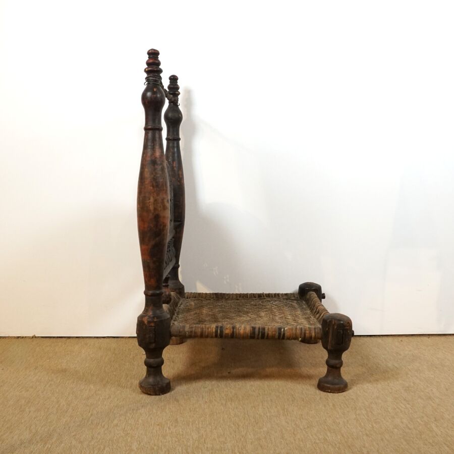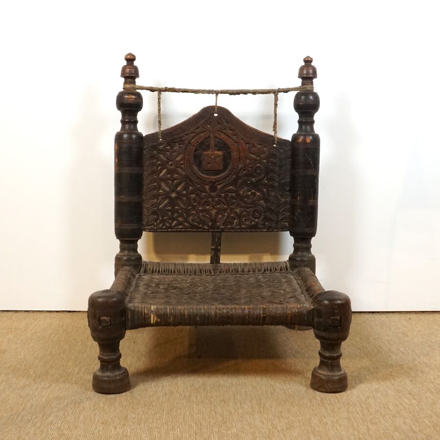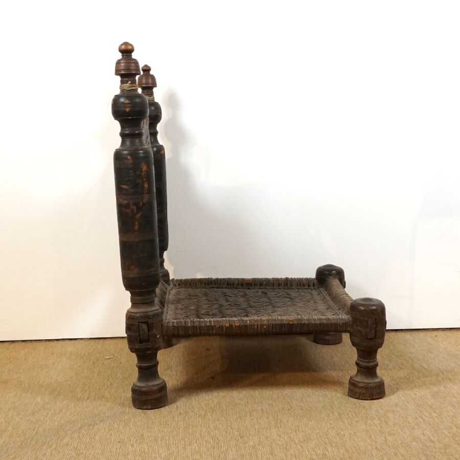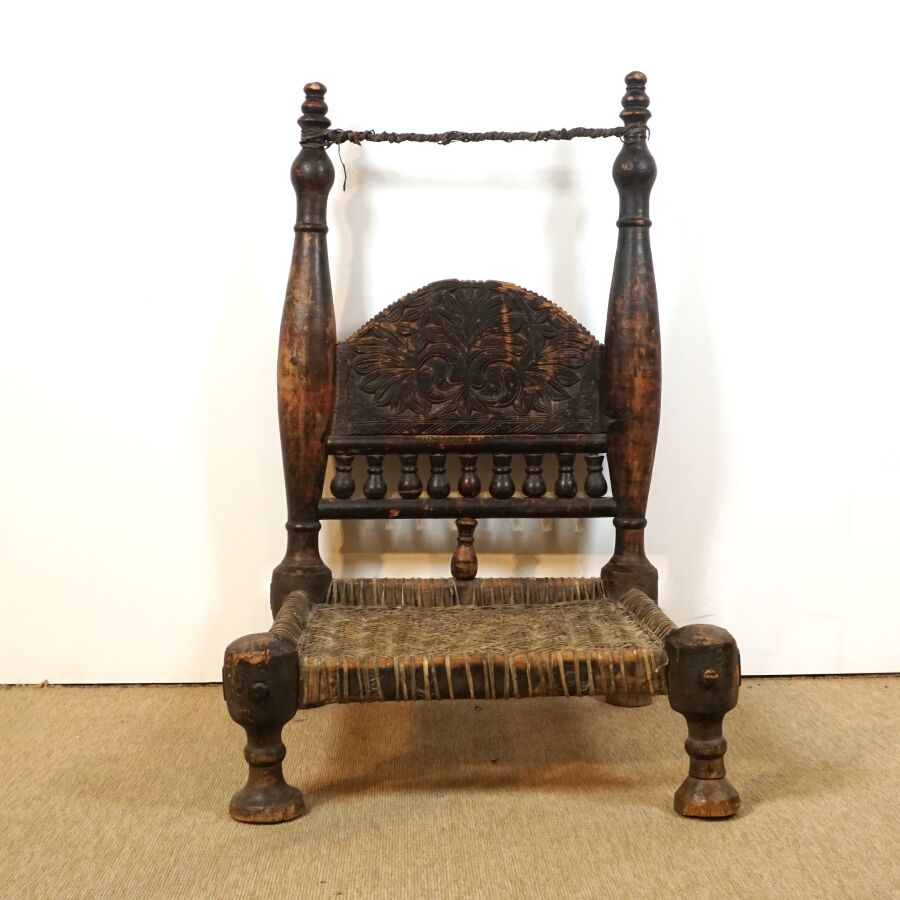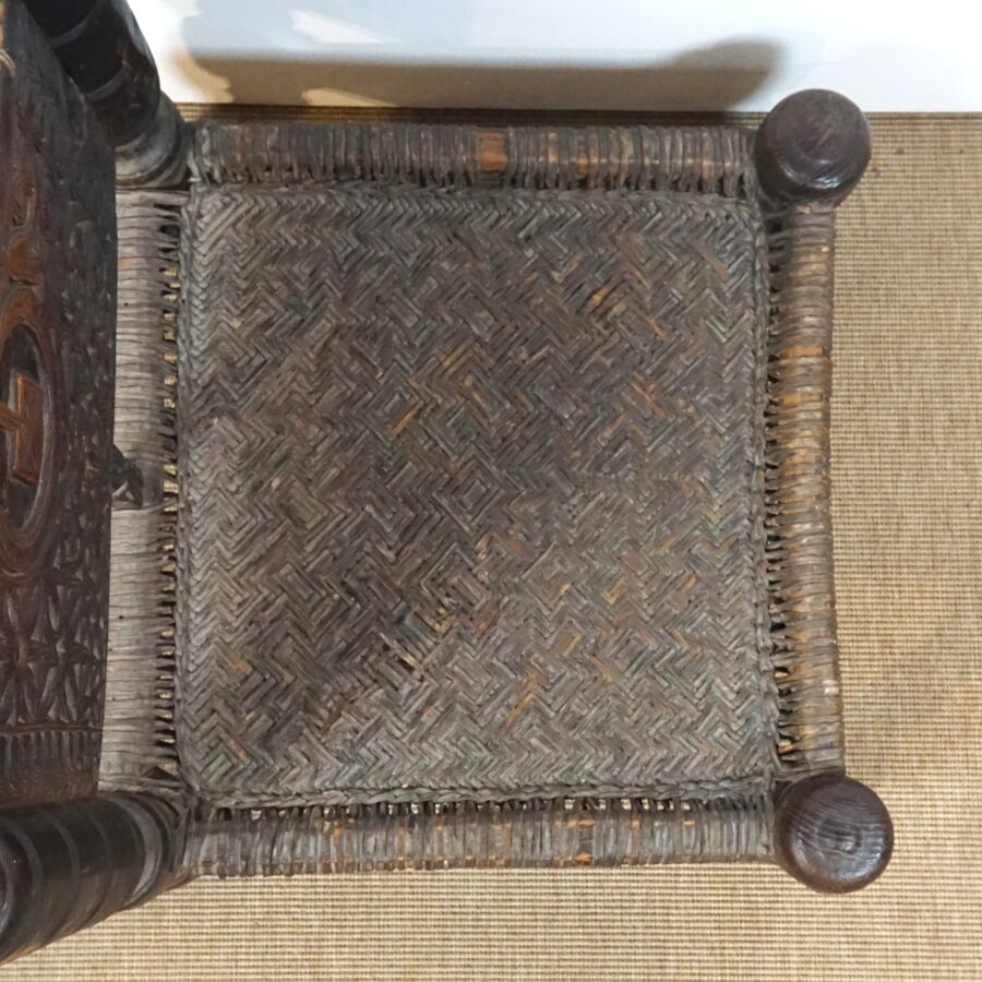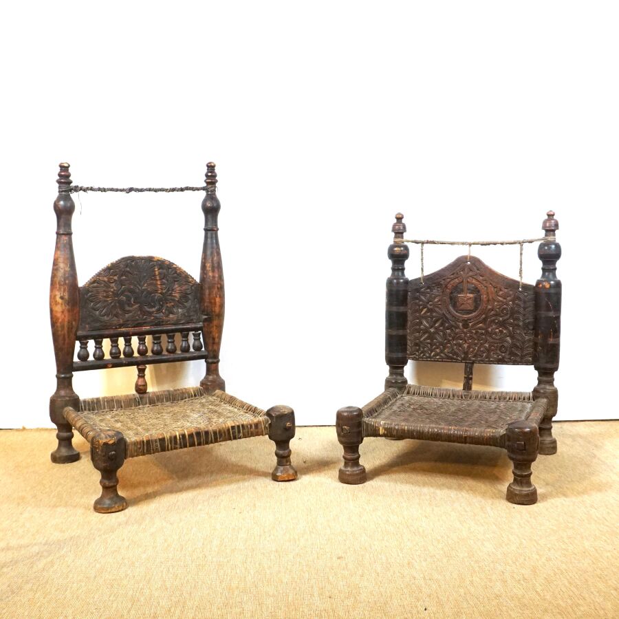 Deux chaises basses traditionnelles en bois sculpté de motifs géométriques, assises en corde tressée, Afghanistan, Dim. De la plus grande : 88 x 55 x 57 cm (usures).
