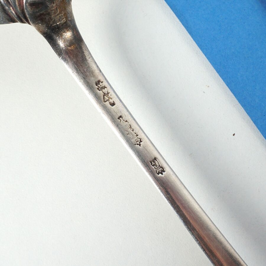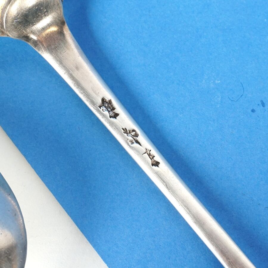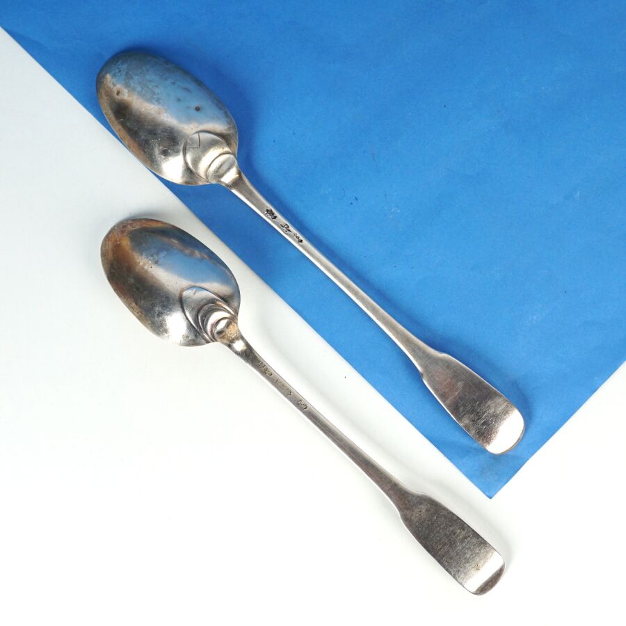 Deux cuillères de service en argent, décor uniplat, l'une au G couronné, probablement Orléans (1762/1768), poinçons difficilement lisibles, L. 29.7 cm et 31.7 cm. Poids brut : 256 g environ.