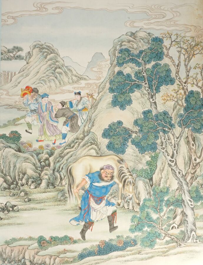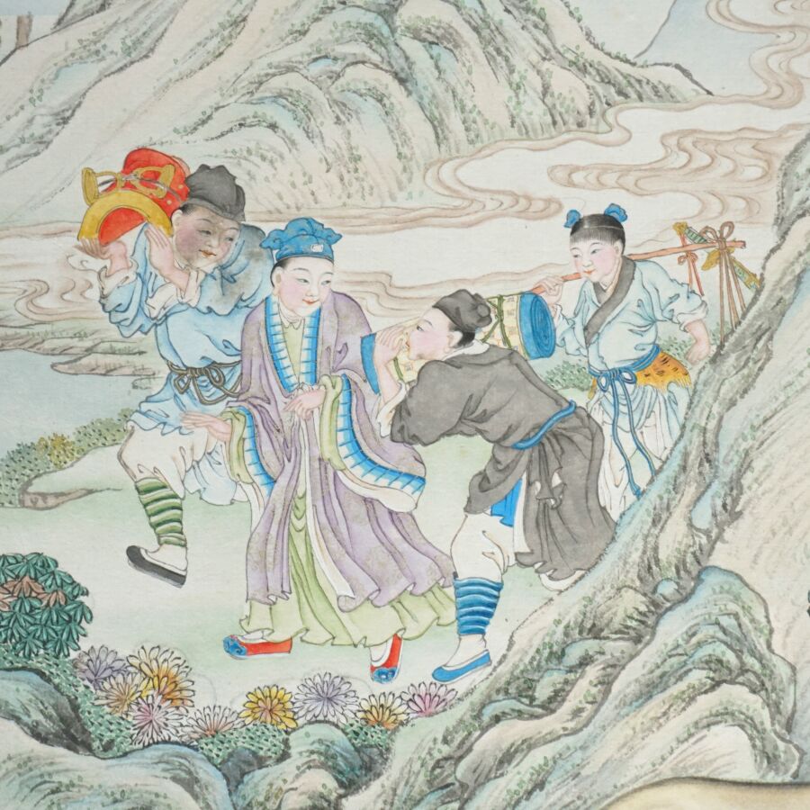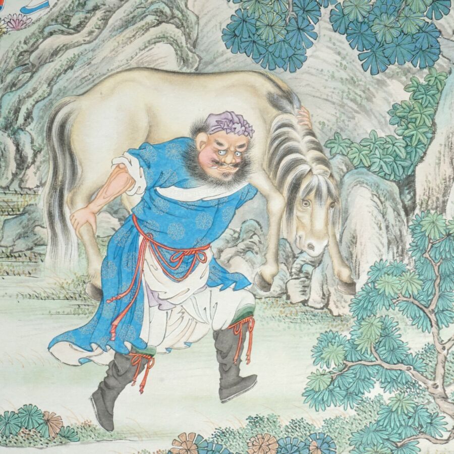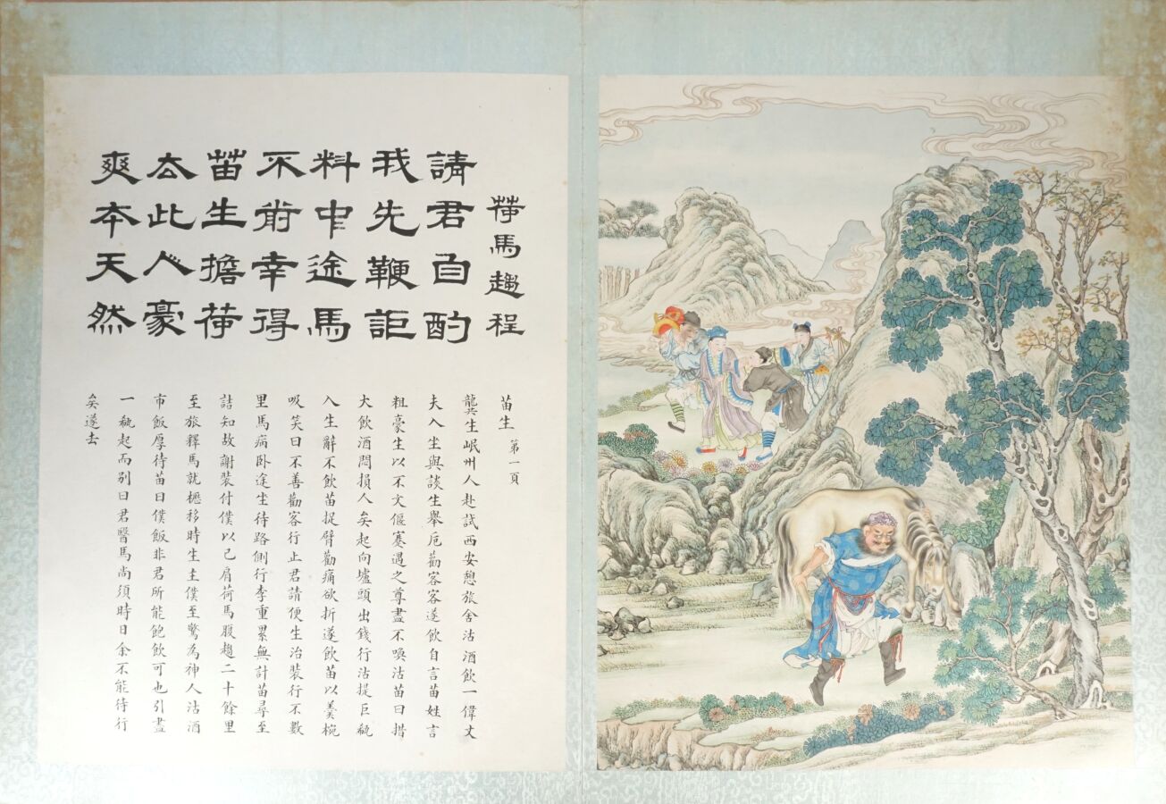 Deux encres sur papier, l'une représentant des calligraphies, illustrant l'oeuvre sur papier de la seconde encre, à décor polychrome, de l'épisode " Miao Seng " issu des contes extraordinaires du pavillon du loisir de Pu Songling " Liaozhai Zhiyi " Chine, époque Qing, Dim. Encres : 44 x 33.5 cm environ.