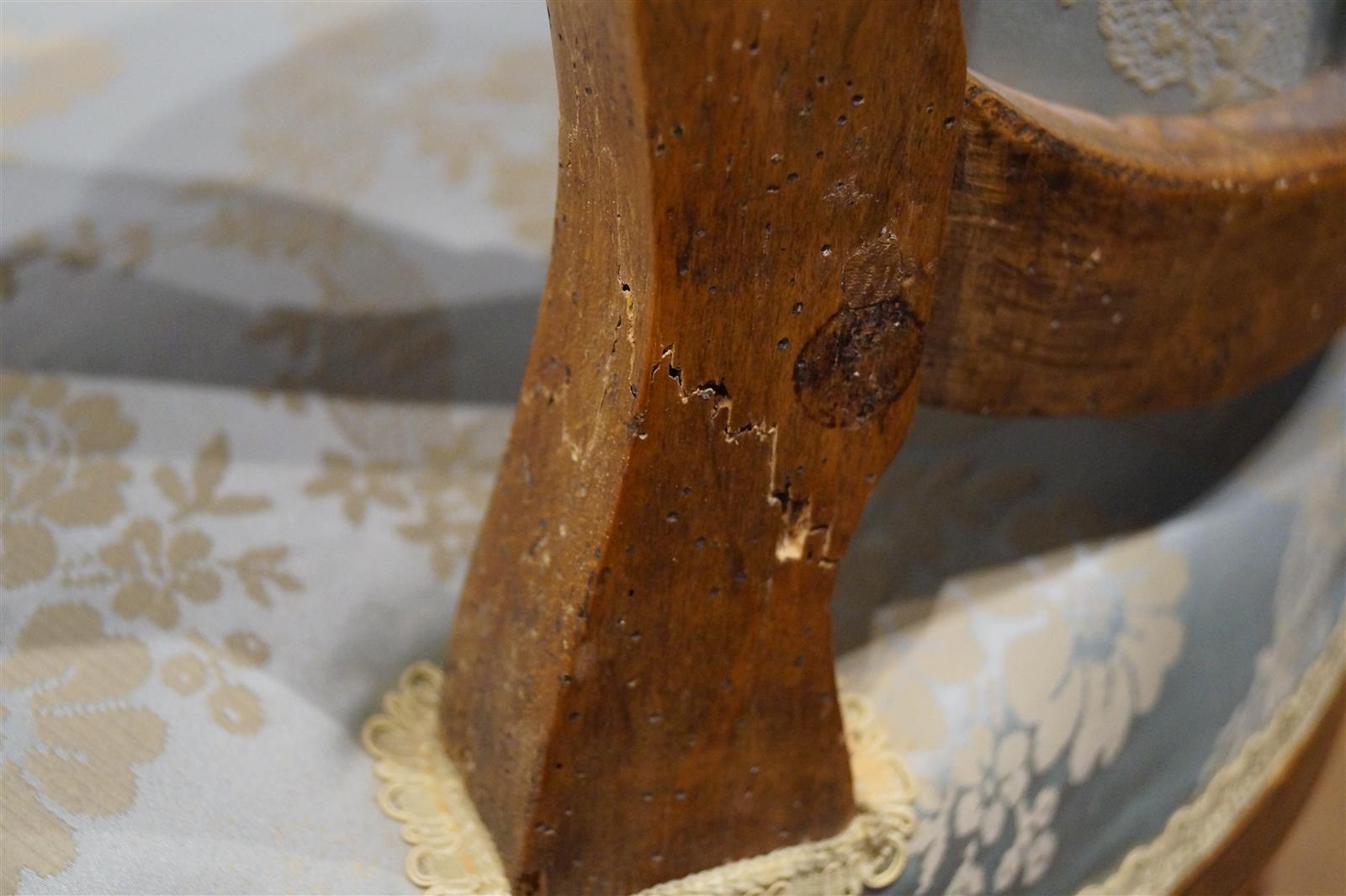Deux fauteuils cabriolets de style Louis XV, dossiers mouvementés en bois naturel ornés de fleurettes, accotoirs en coup de fouet, piétement cambré, garniture de soie verte, 18e siècle, H. 88 cm (un pied enté, un montant cassé, restaurations)