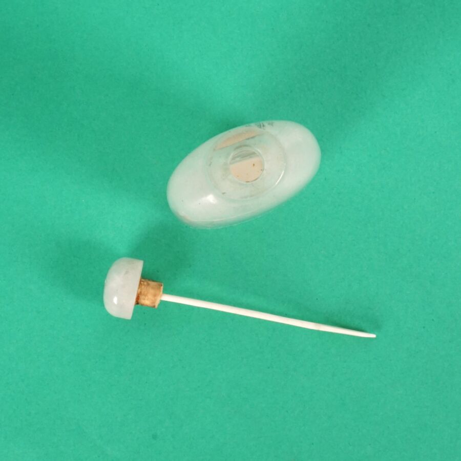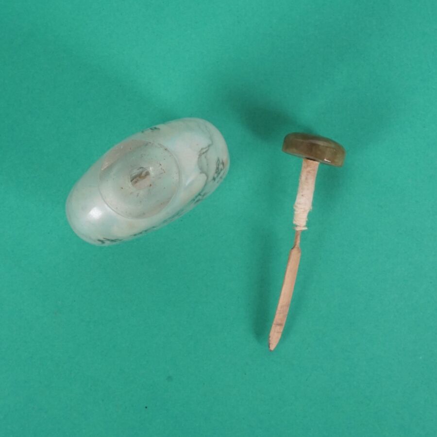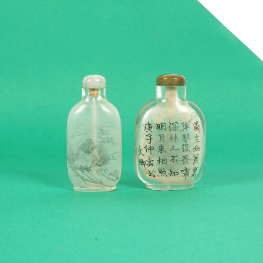 Deux flacons tabatières en verre peint, l'un d'après l'artiste Zhang Baotian (Maître flacon tabatière sous le règne de l'empereur Guangxu) daté de 1893, le bouchon surmonté d'une jadéite, à décor montagneux et lacustre, le second orné d'un poème calligraphié évoquant le sentiment de solitude, porte une signature de Wen Qing, daté de 1840, Chine, fin du 19ème - début du 20ème siècle, H. 6.8 cm et 7 cm.