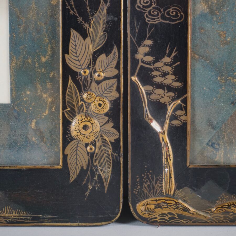 Deux gouaches de Canton représentant une dame de cour assise en majesté parée de ses bijoux et un homme de cour en costume traditionnel, Canton, Chine, fin du 19ème siècle, présentées dans deux encadrements en laque noire et dorée à décor en léger relief de compositions florales et arbustes (Angleterre).