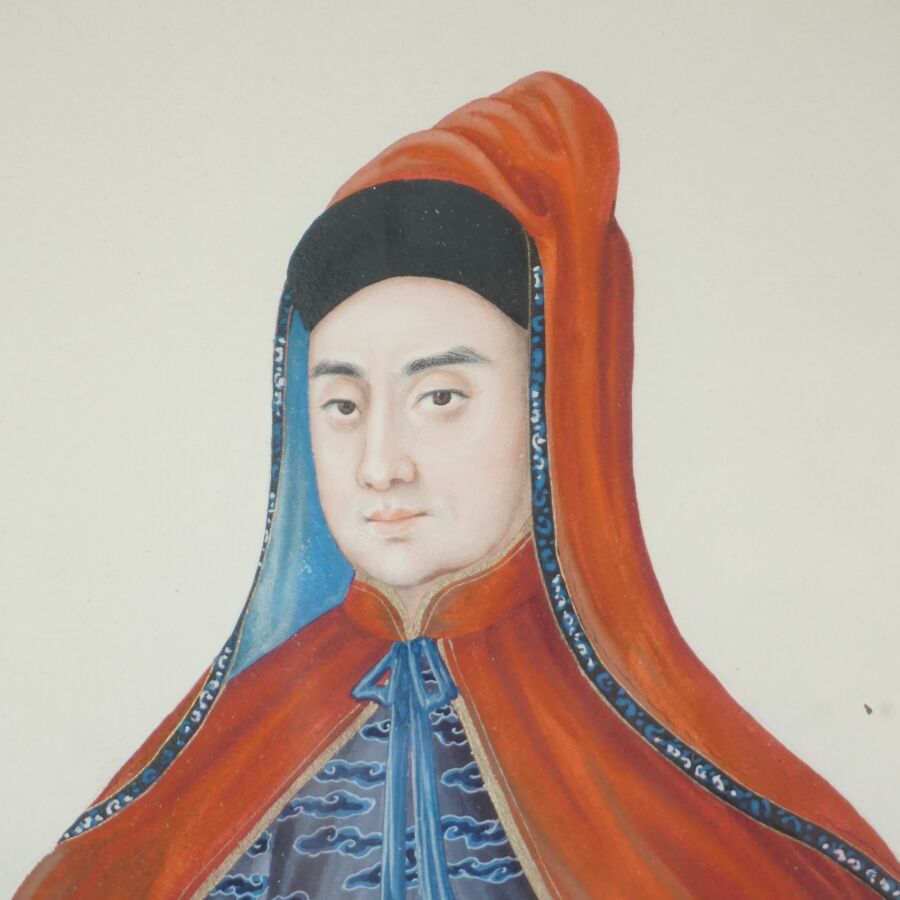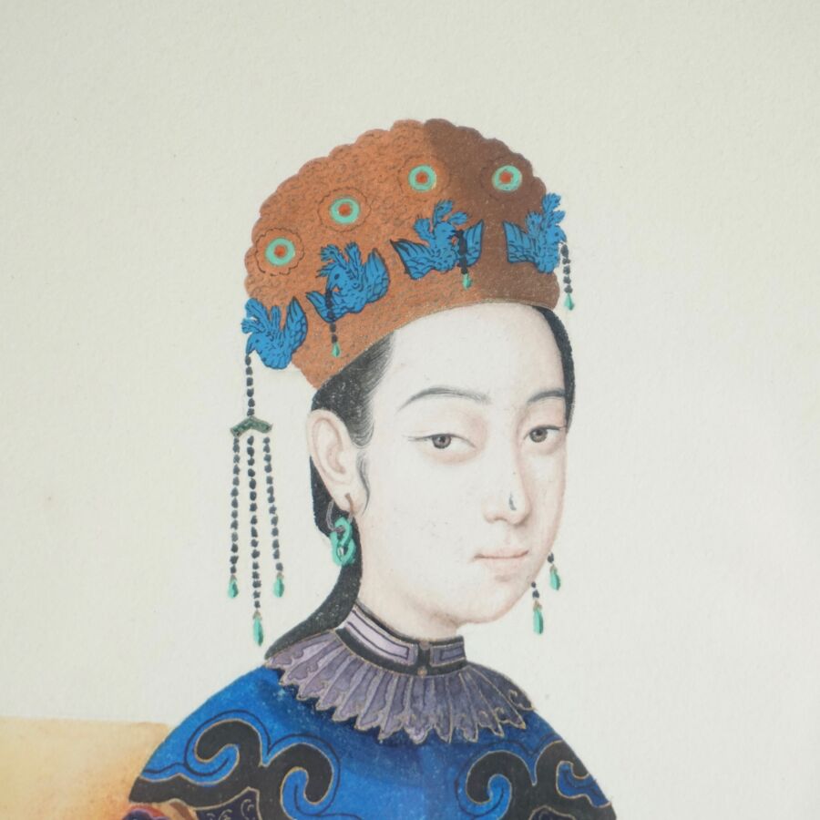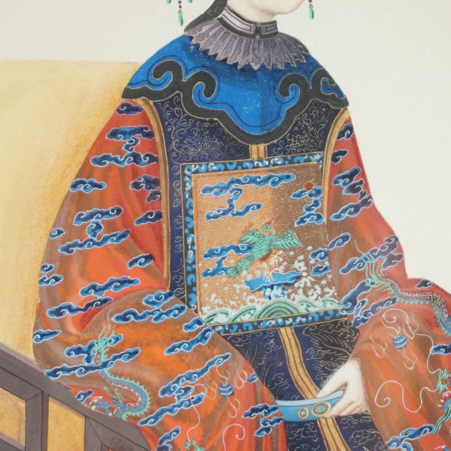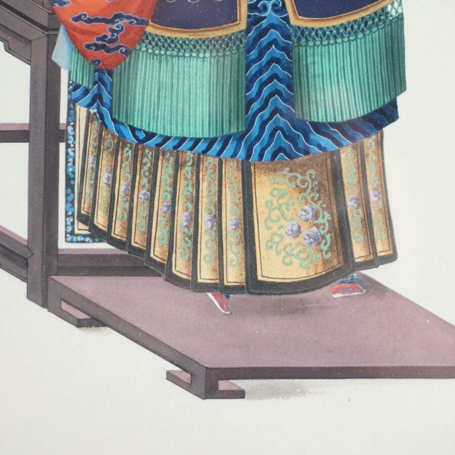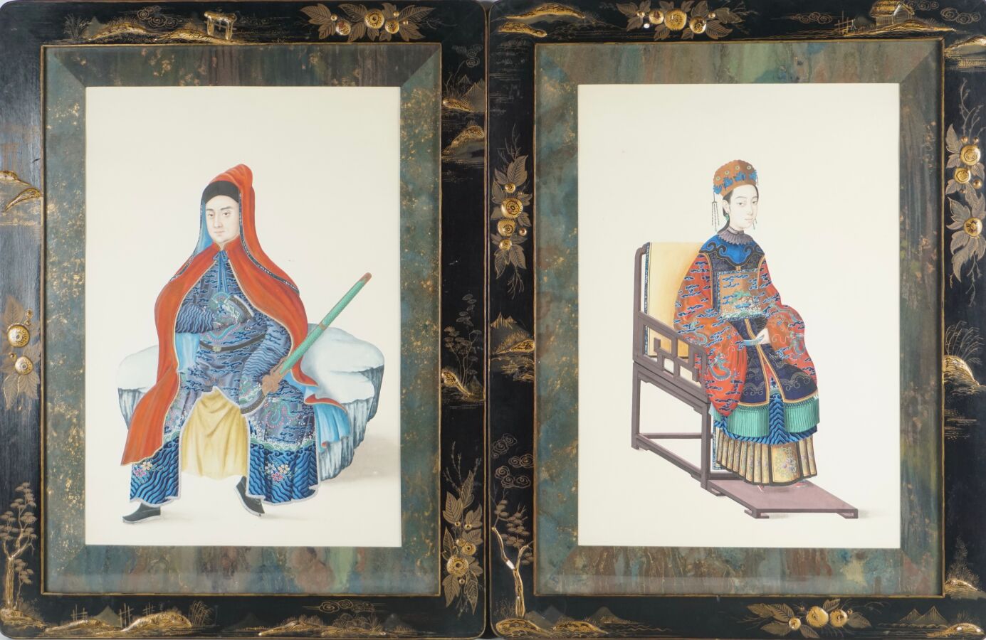 Deux gouaches de Canton représentant une dame de cour assise en majesté parée de ses bijoux et un homme de cour en costume traditionnel, Canton, Chine, fin du 19ème siècle, présentées dans deux encadrements en laque noire et dorée à décor en léger relief de compositions florales et arbustes (Angleterre).