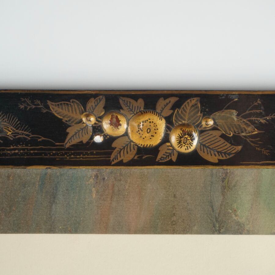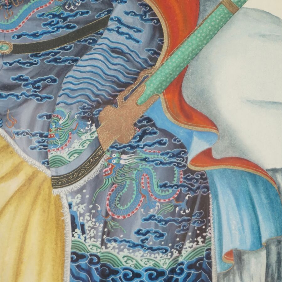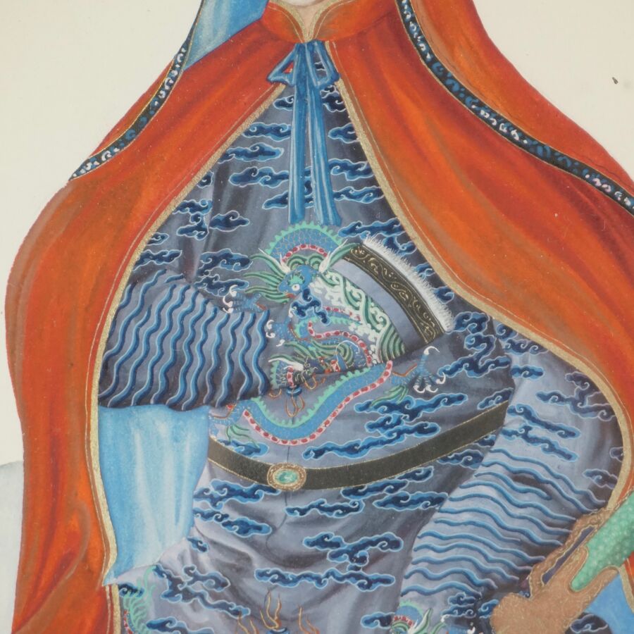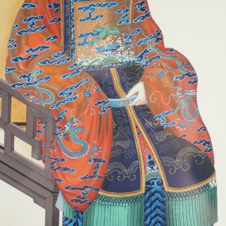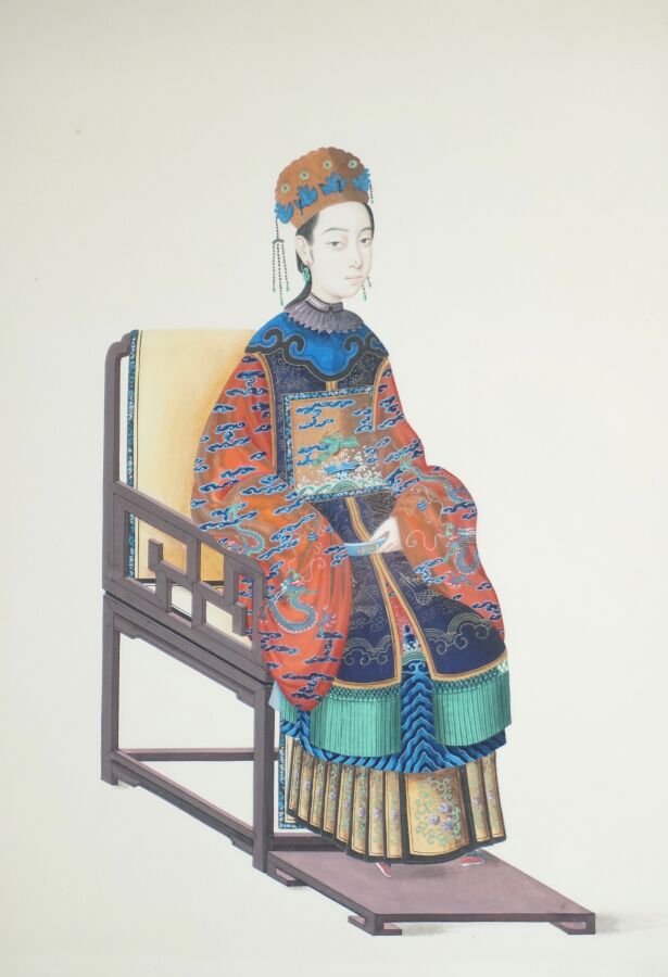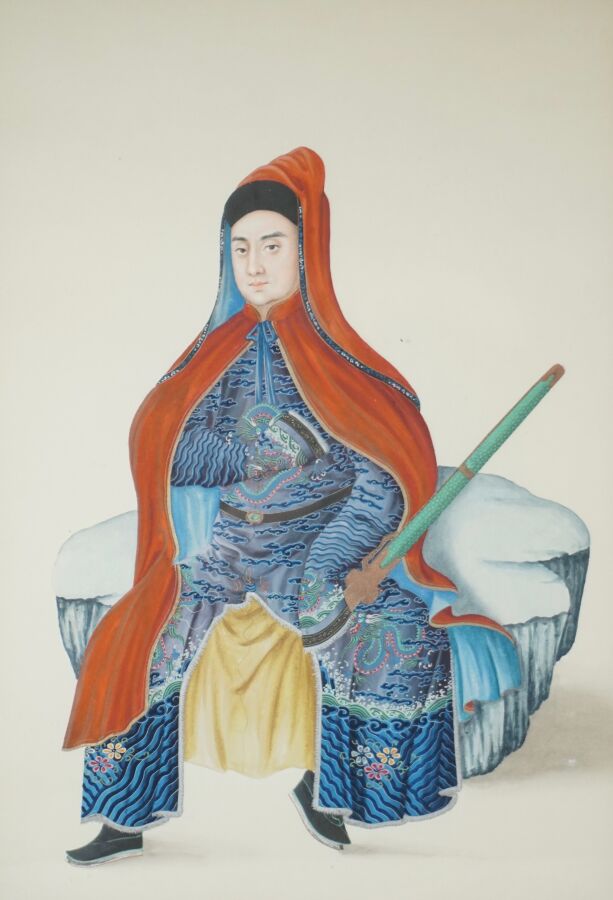 Deux gouaches de Canton représentant une dame de cour assise en majesté parée de ses bijoux et un homme de cour en costume traditionnel, Canton, Chine, fin du 19ème siècle, présentées dans deux encadrements en laque noire et dorée à décor en léger relief de compositions florales et arbustes (Angleterre).
