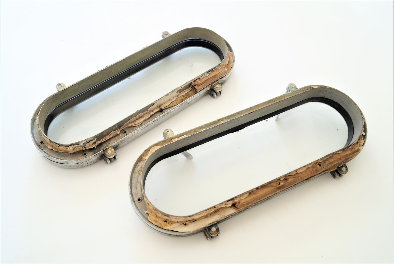 Deux hublots de forme oblongue en bronze chromé à deux fermoirs, 49 x 21 cm (oxydations).
