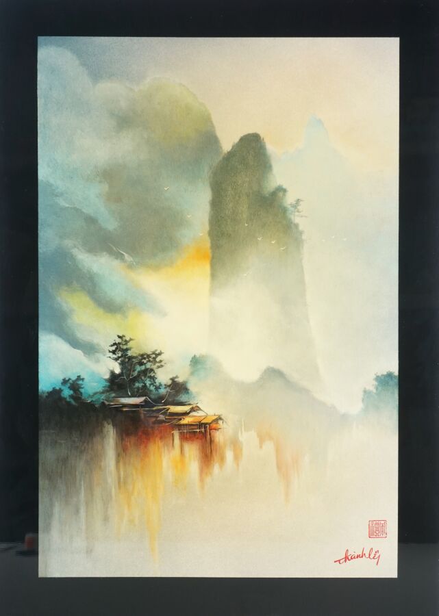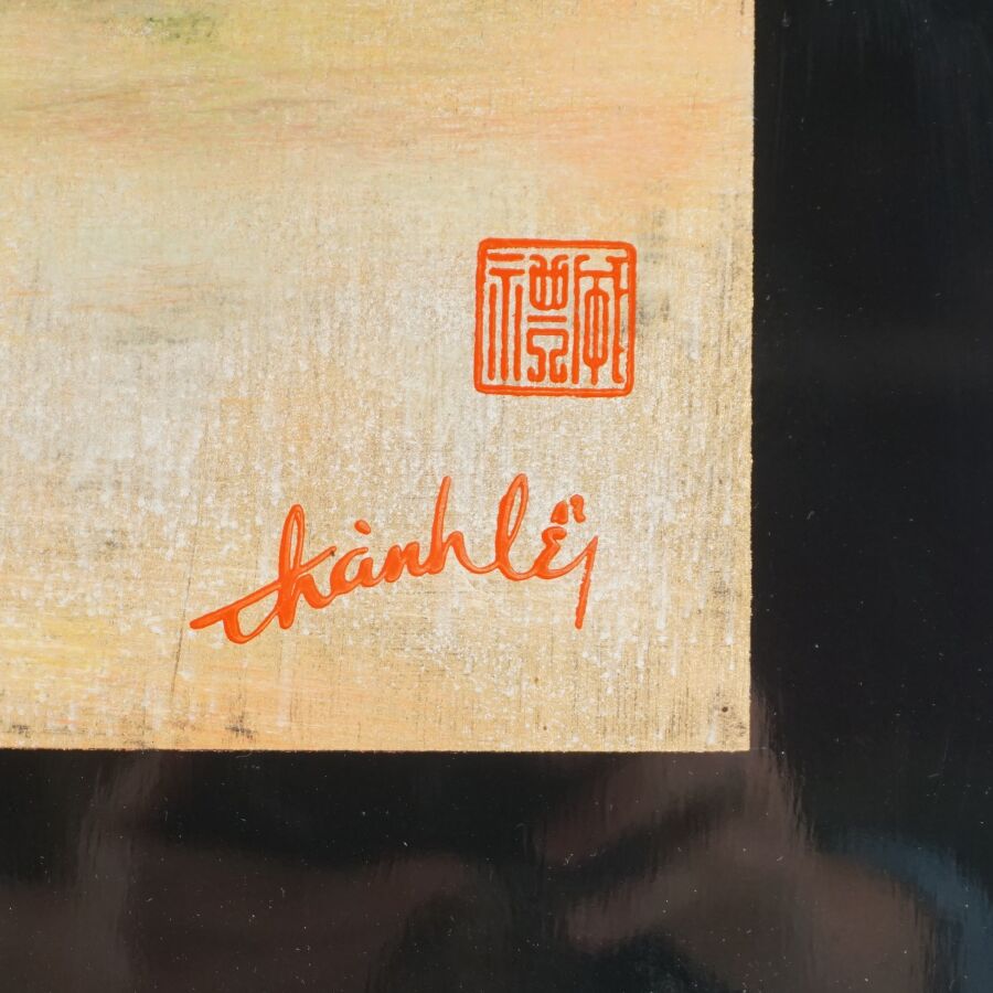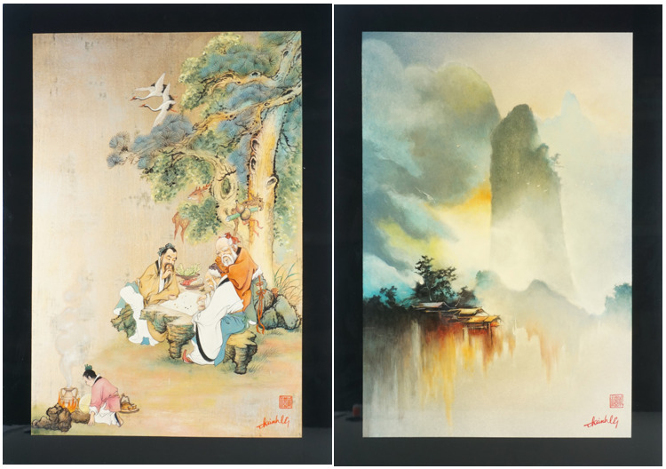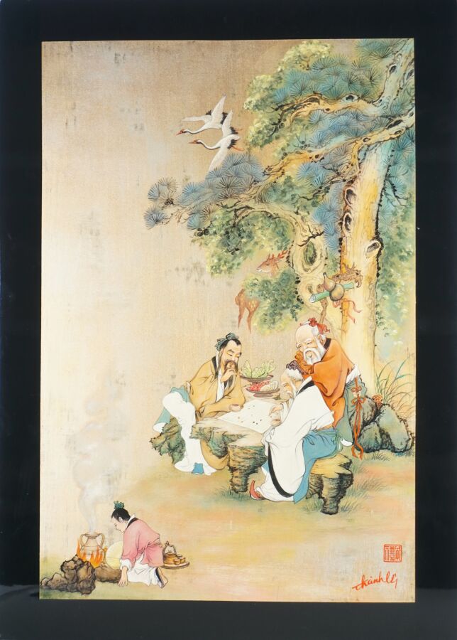 Deux impressions occidentales sur panneau en laque noire à décor polychromes de lettrés sous un pin et d'un paysage lacustre, portent les signatures de Thanh Ley, Vietnam, travail moderne, Dim. 70 x 50 cm et 69.5 x 49.5 cm (légères rayures).