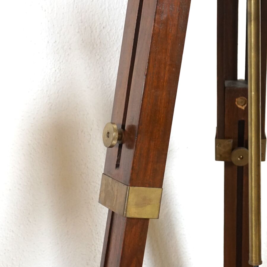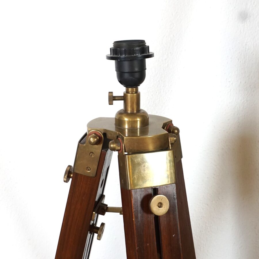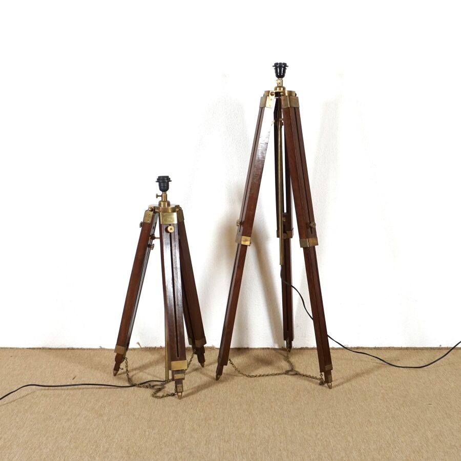 Deux lampadaires tripodes en bois et laiton doré, hauteur ajustable, H. de 73.5 cm à 115 cm environ (sans abat-jours, usures et traces).