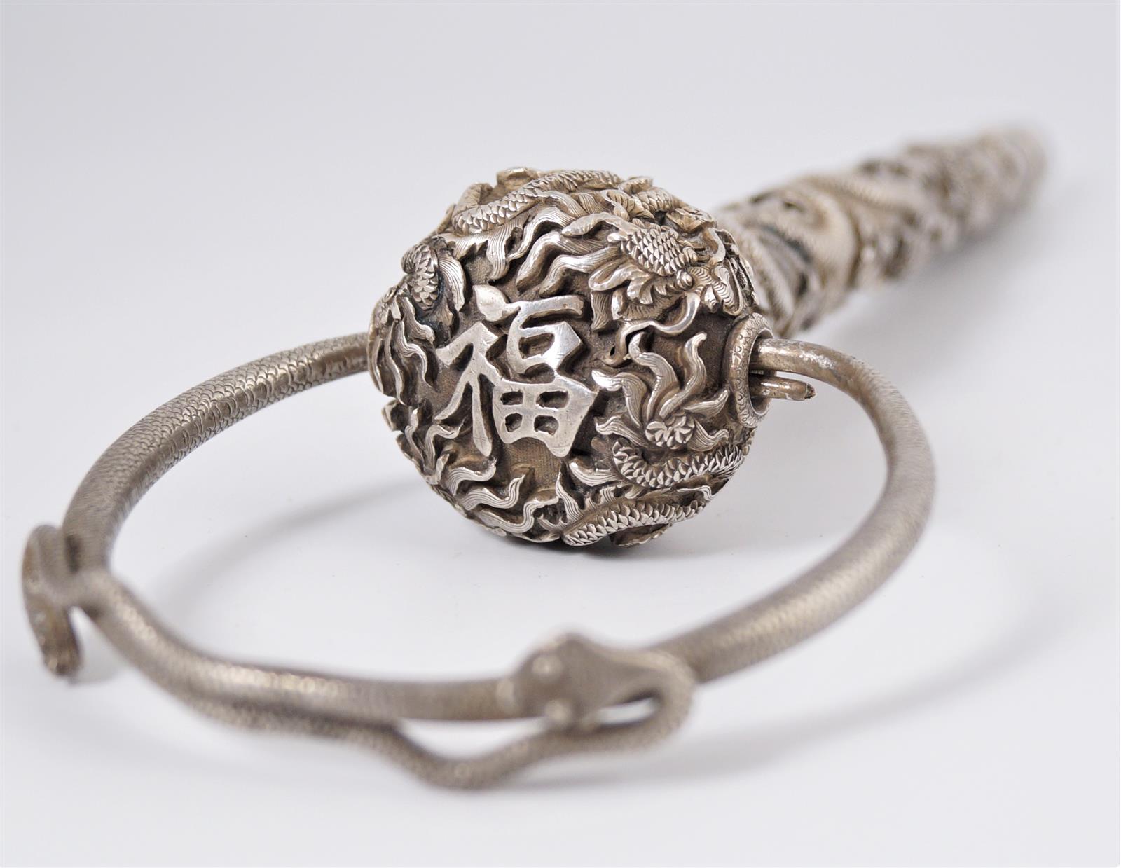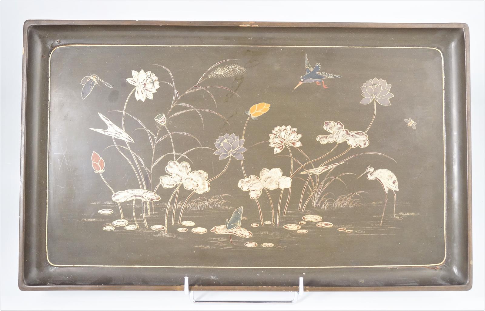 Deux manches d'ombrelles en argent étranger à décor de dragons et de personnages, Chine, début du 20e siècle, L. 30 et 24.5 cm. On joint un plateau en laque à décor lacustre de l'exposition de Chine de 1902, 31.5 x 53 cm (accidents)