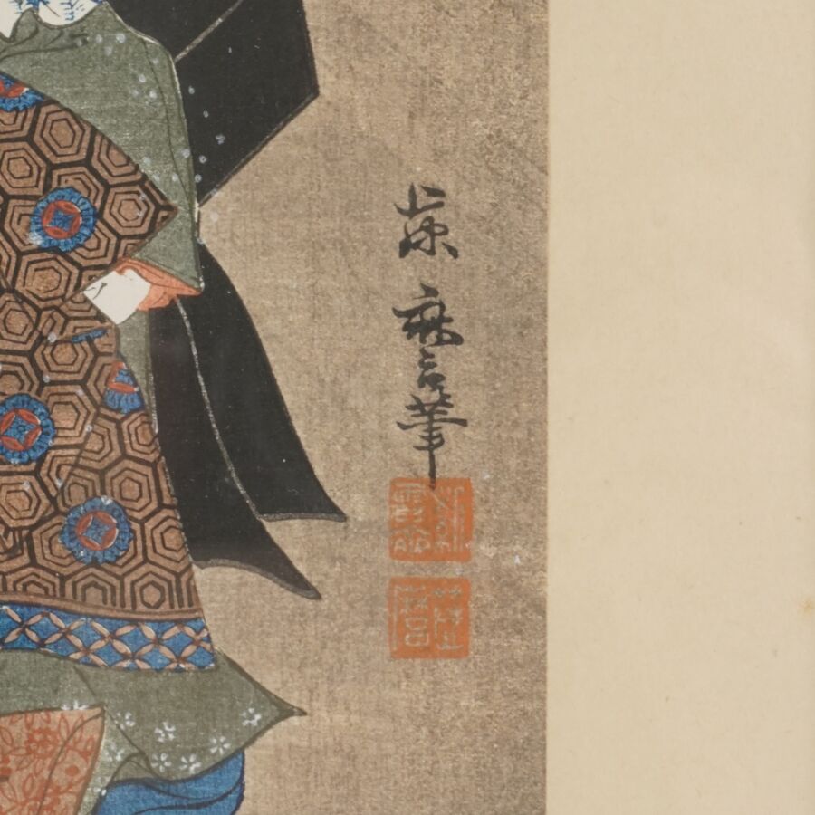 Et une impression réhaussée d'après Kitagawa Fujimaro titrée " Beauty in the snow ",30 x 19.5 cm (à vue).