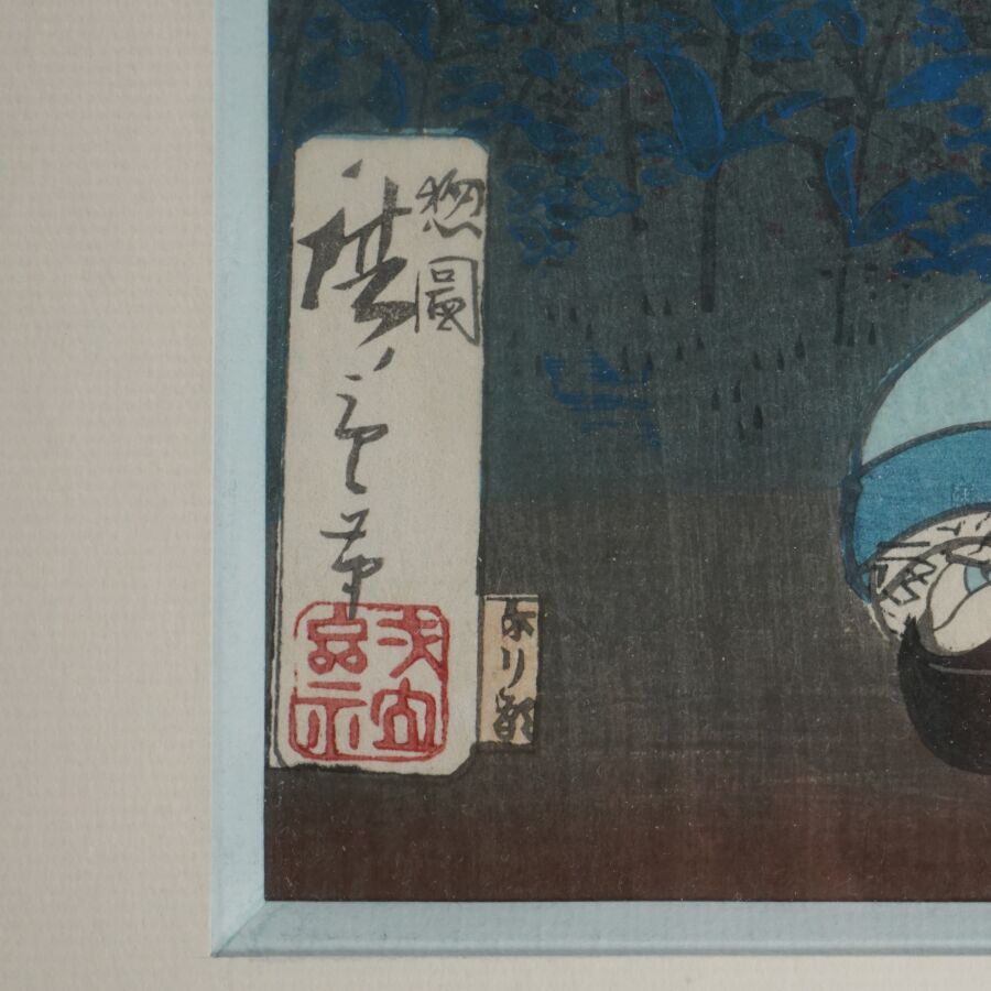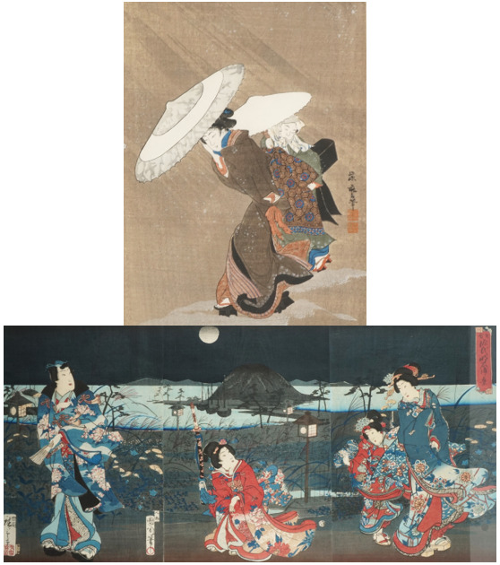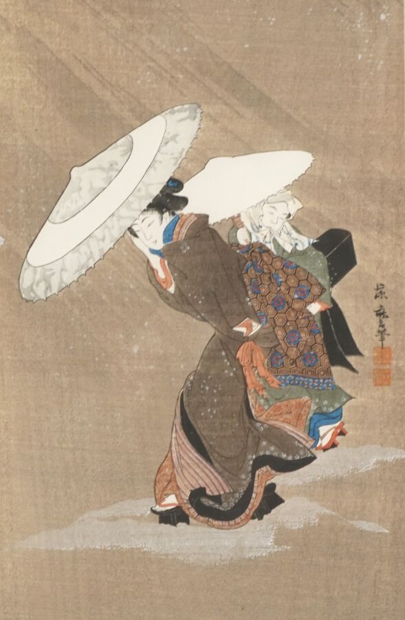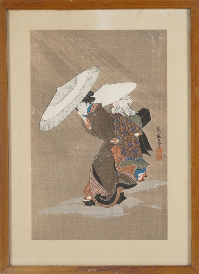 Et une impression réhaussée d'après Kitagawa Fujimaro titrée " Beauty in the snow ",30 x 19.5 cm (à vue).