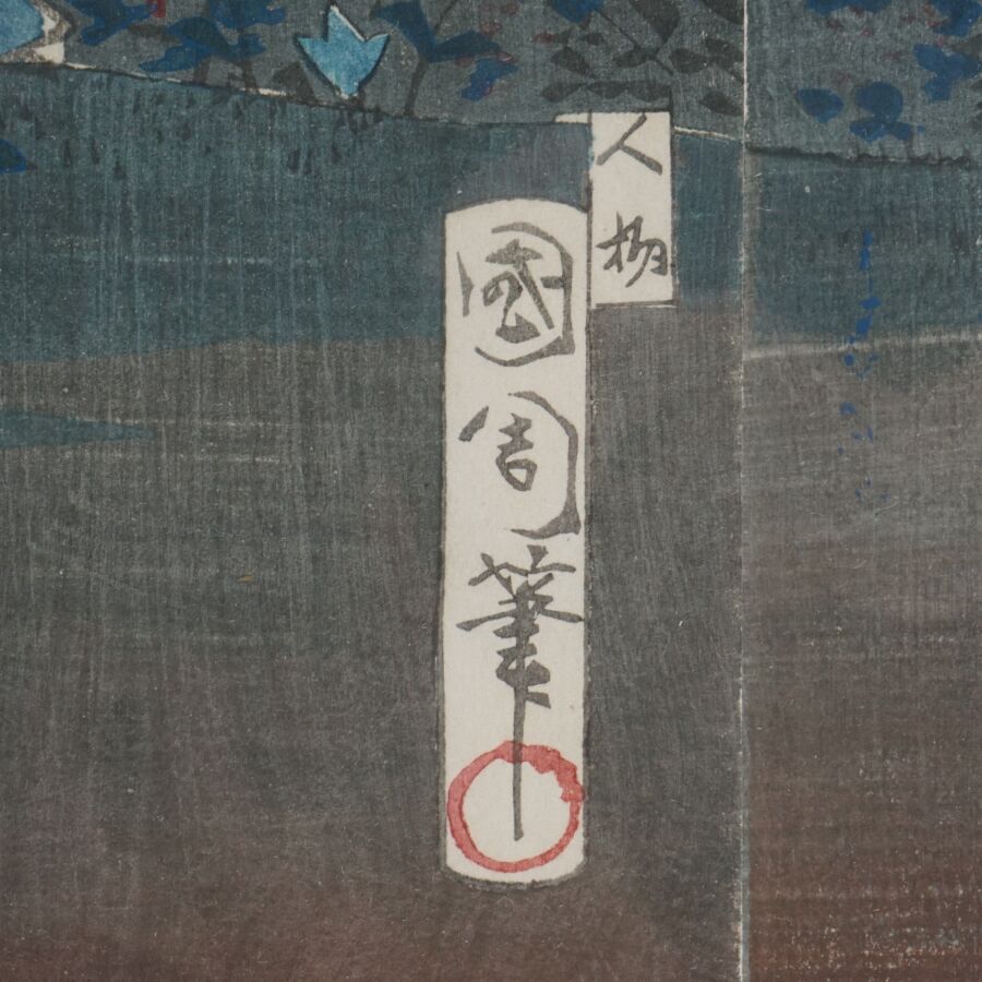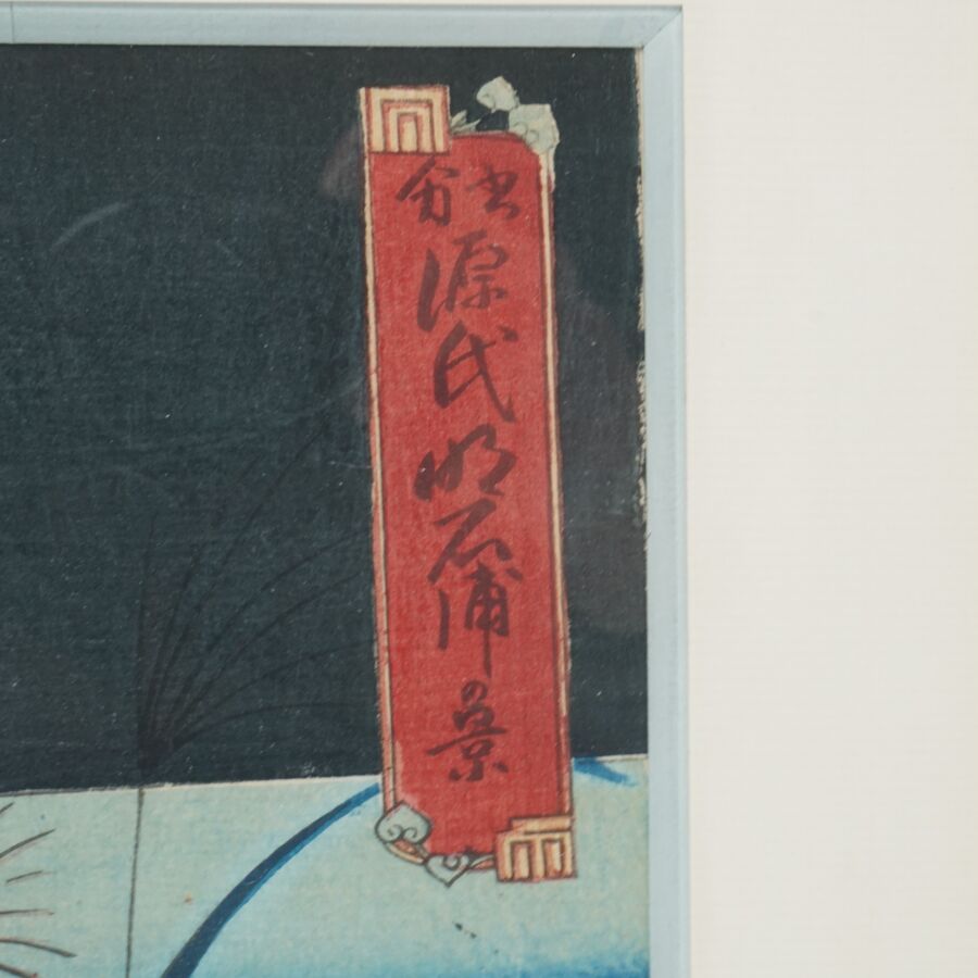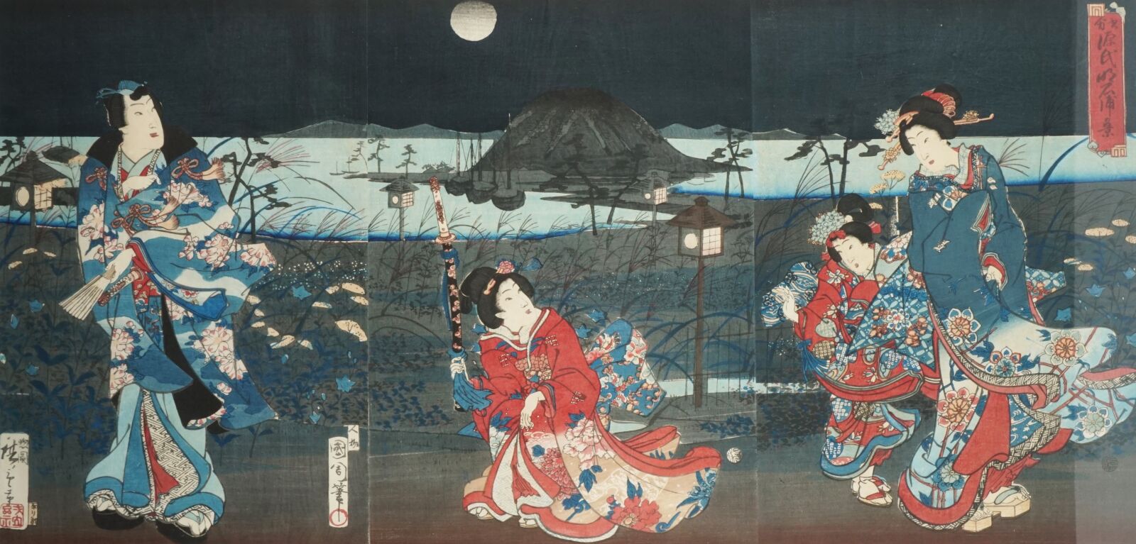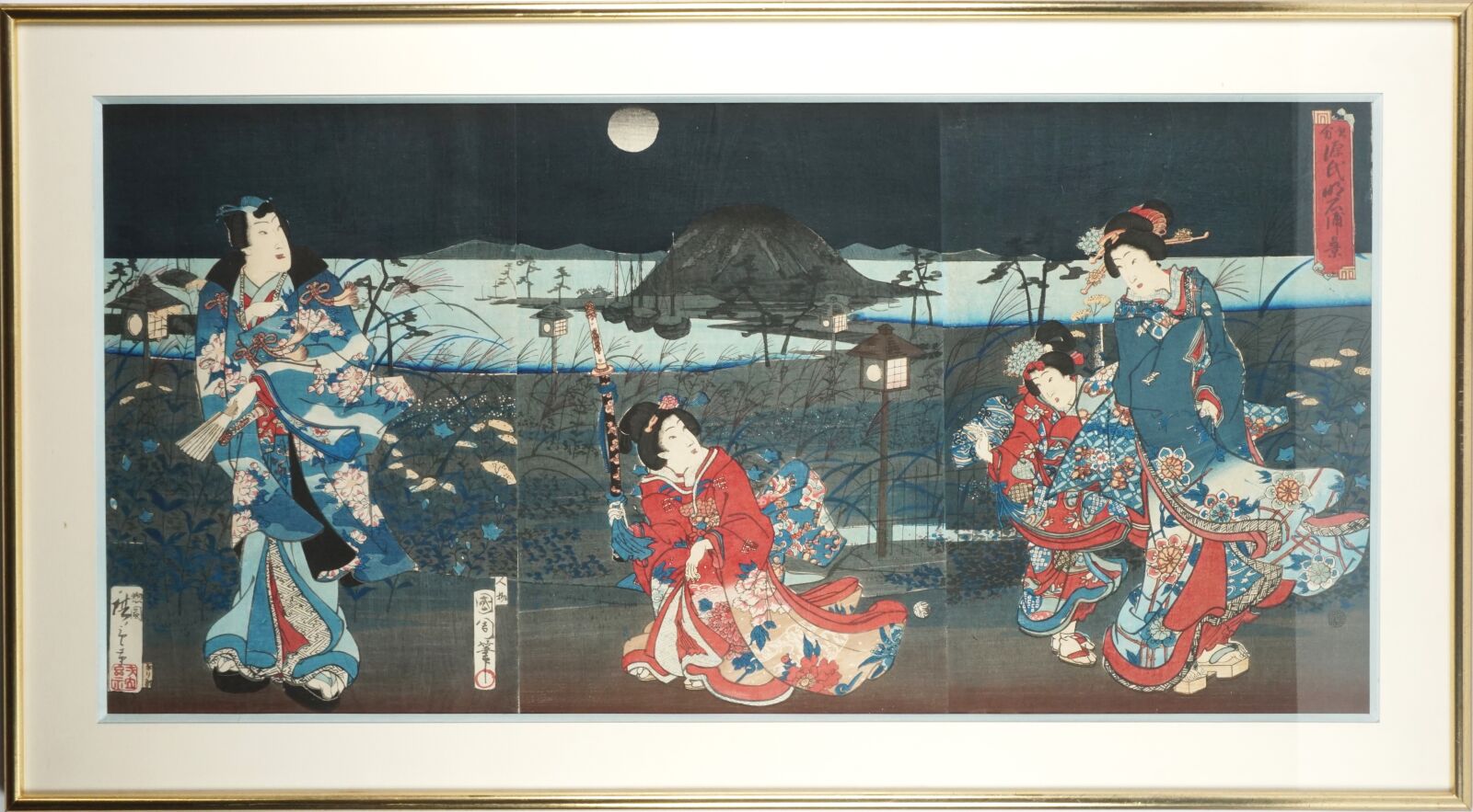 Trois estampes de format oban tate-e formant triptyque de Toyohara Kunichika "Vue de la baie d'Akashi" 33.5 x 70 cm (à vue).