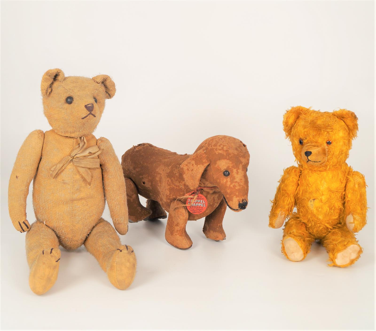 Deux ours, dont un en peluche rase avec yeux bouton de bottine, H. 41 cm. On joint un chien TRIPPEL TRAPPEL (mauvais état).
