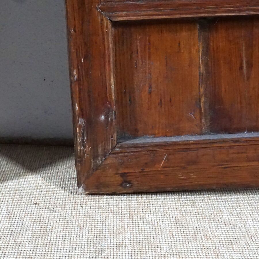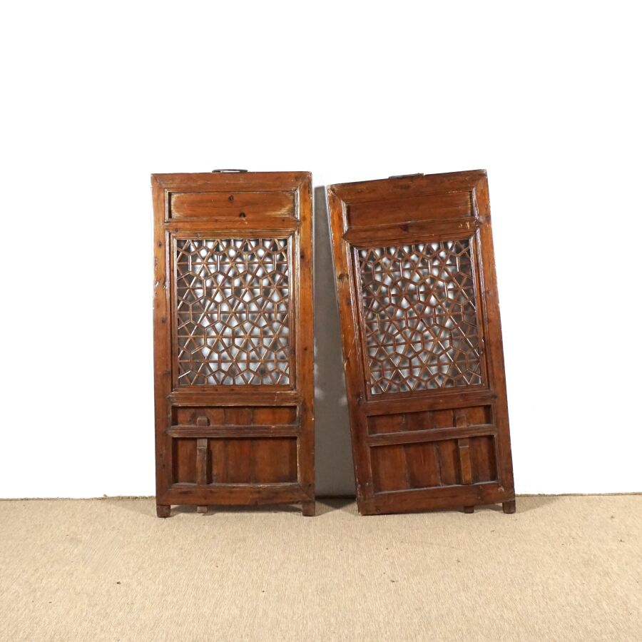 Deux panneaux en bois sculpté et ajouré, poignée en partie haute, 106 x 49 cm (manque un pied à l'un).