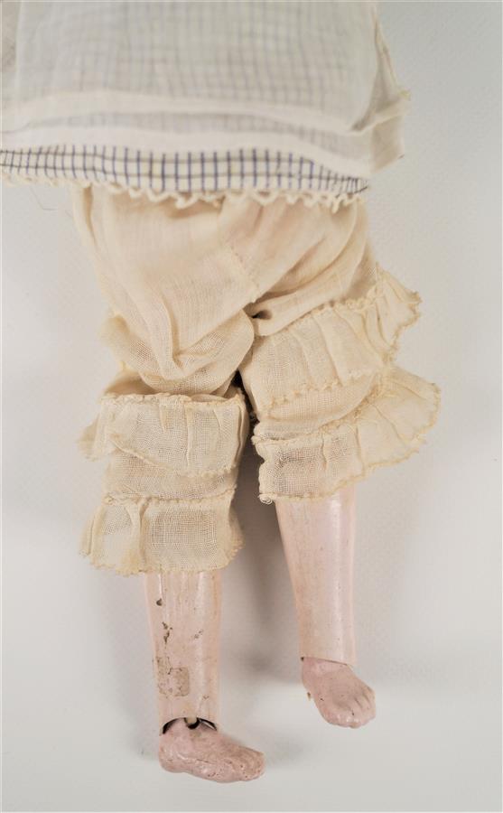 Deux petits bébés type MOTCHMANN, têtes pleines en composition couverte de cire, yeux en verre émaillé, corps articulé en bois et tissu, mécanisme de voix, l'un tête mobile, H. 25 cm (accidents, usures et craquelures d'usage).