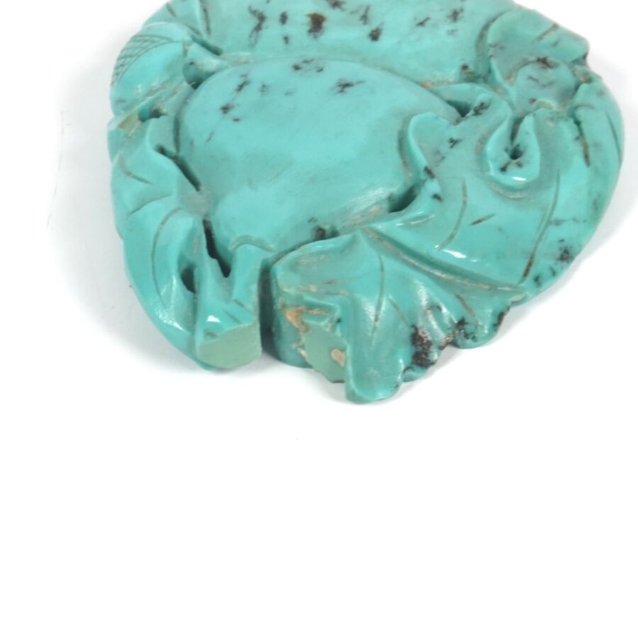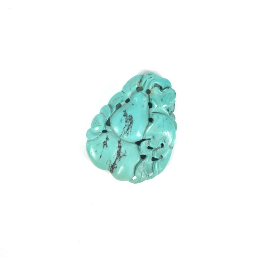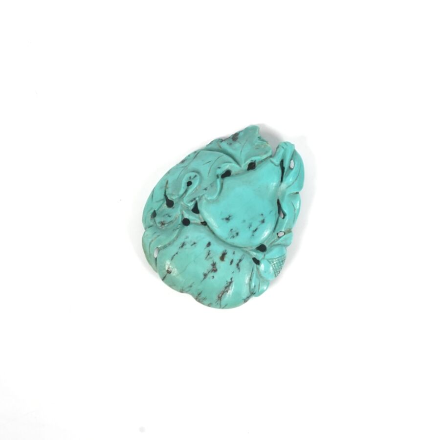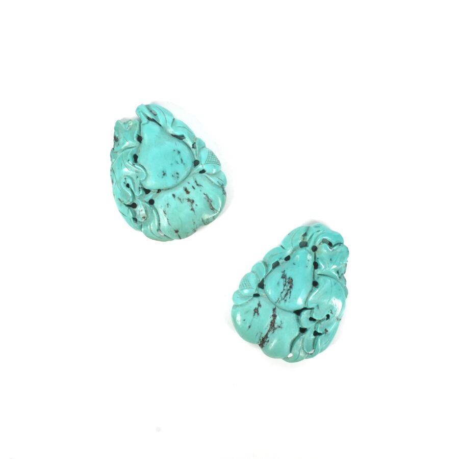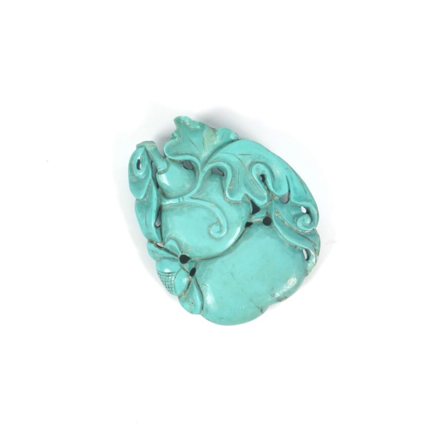 Deux petits pendentifs en turquoise sculptée à motif de coloquintes et tiges feuillagées, Chine, circa 1920, Dim. 4 x 3.5 cm environ. Poids brut : 29.9 g environ (accident à l'un).