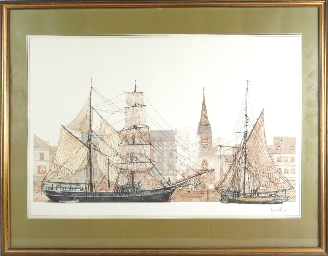 Deux pièces encadrées comprenant "Deux voiliers au quai" 83, reproduction signée (49 x 64 cm à vue) et "Trois-mâts", lithographie couleurs, justifiée 45/80 et signée dans la marge en bas à droite (22 x 28.5 cm à vue) (quelques traces).