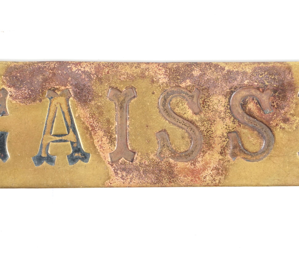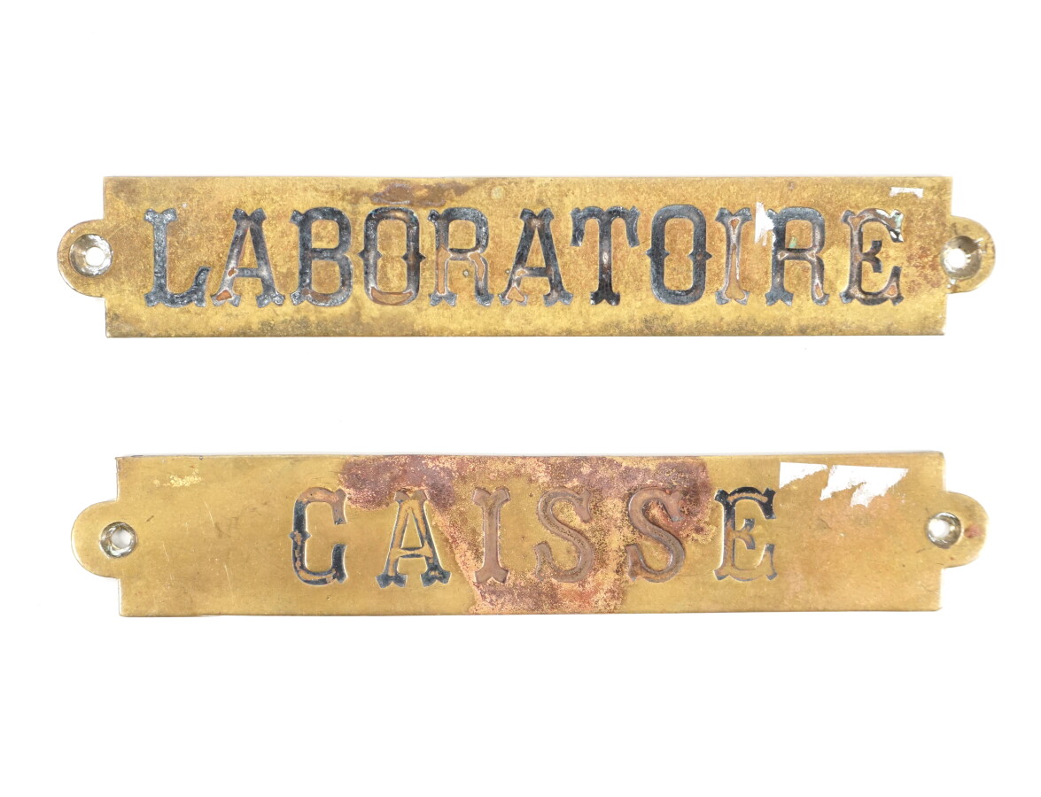 Deux plaques en bronze doré "Caisse" et "Laboratoire", travail ancien, 3.3 x 20 cm (petites usures, traces).