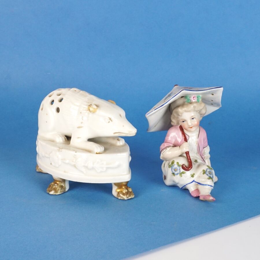Deux porte cure-dents en porcelaine émaillée polychrome figurant une jeune fille au parapluie et un porc-épic, H. 9 cm et 10 cm (petites usures).