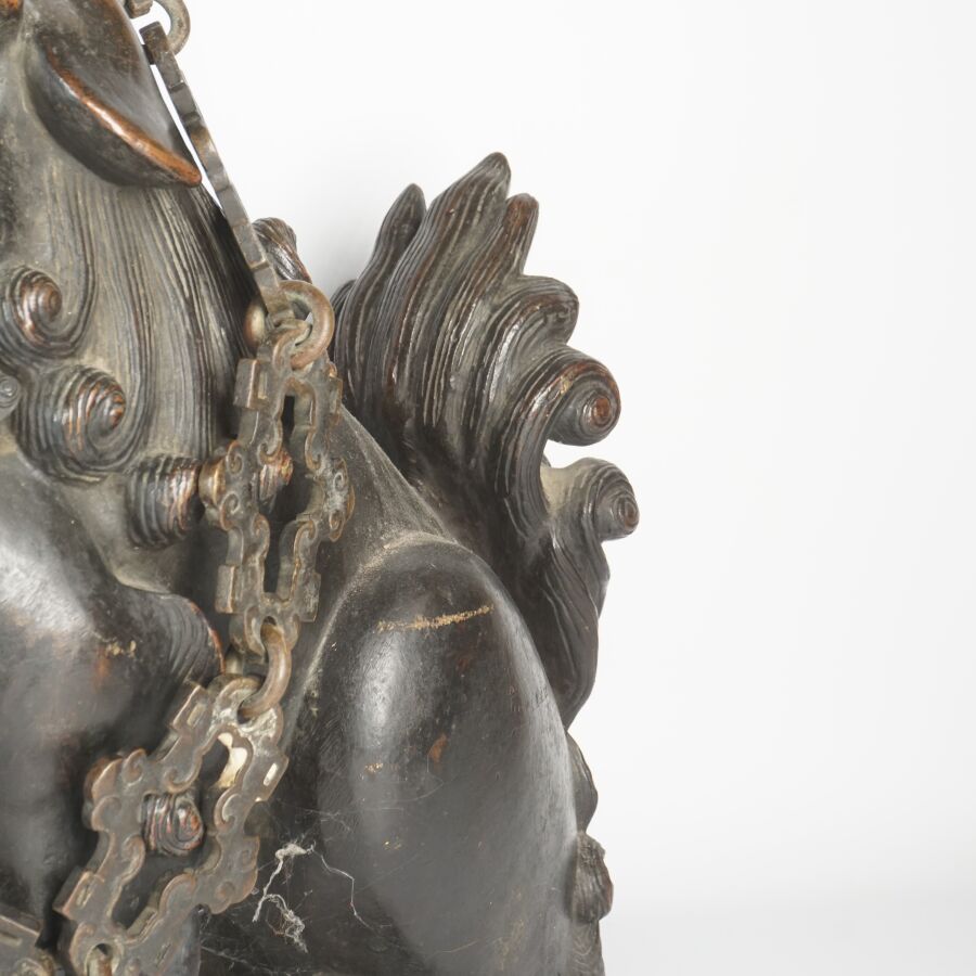Deux sculptures en bronze à patine brune figurant un Qilin et un lion bouddhique formant des gardiens de temple, l'un retenant une chaîne, Chine, début du 20ème siècle, H. 39 cm (petites usures à la patine).