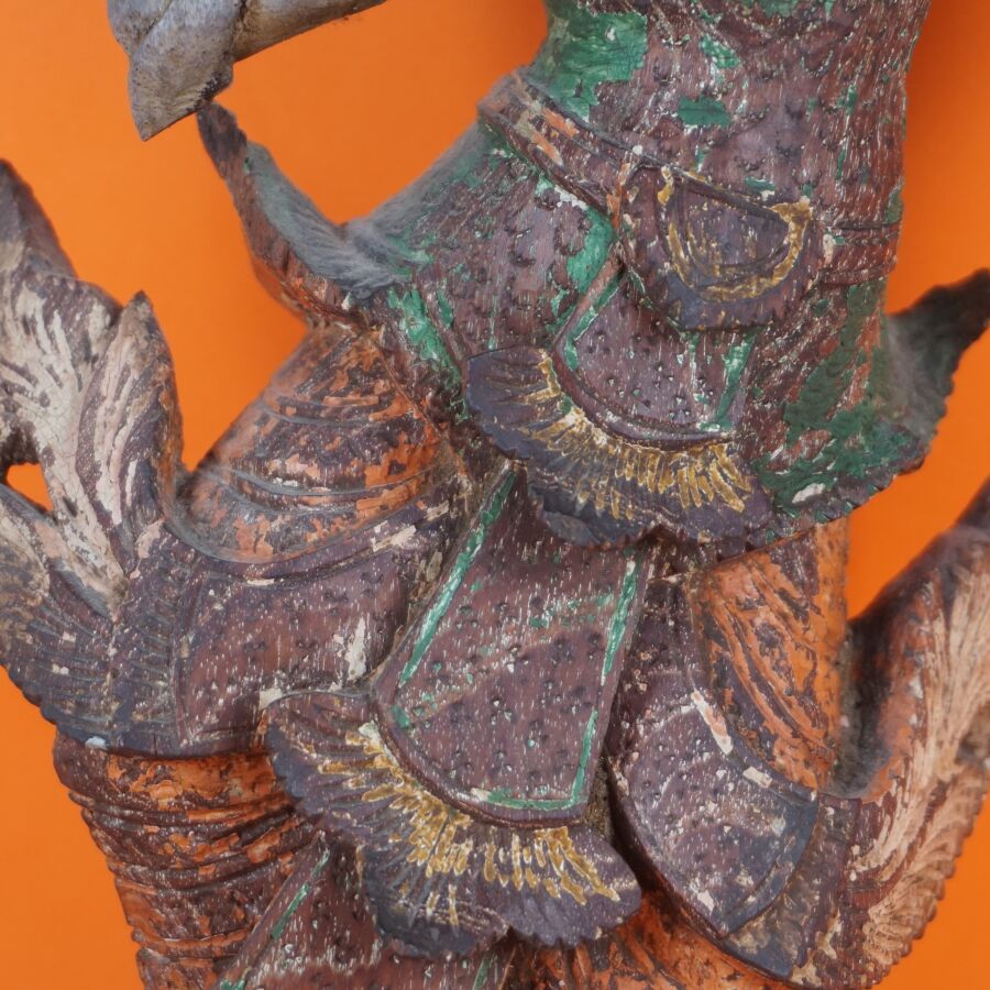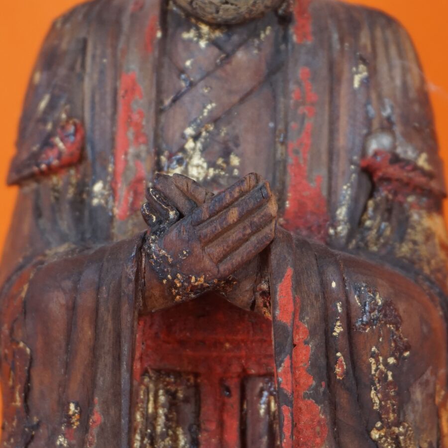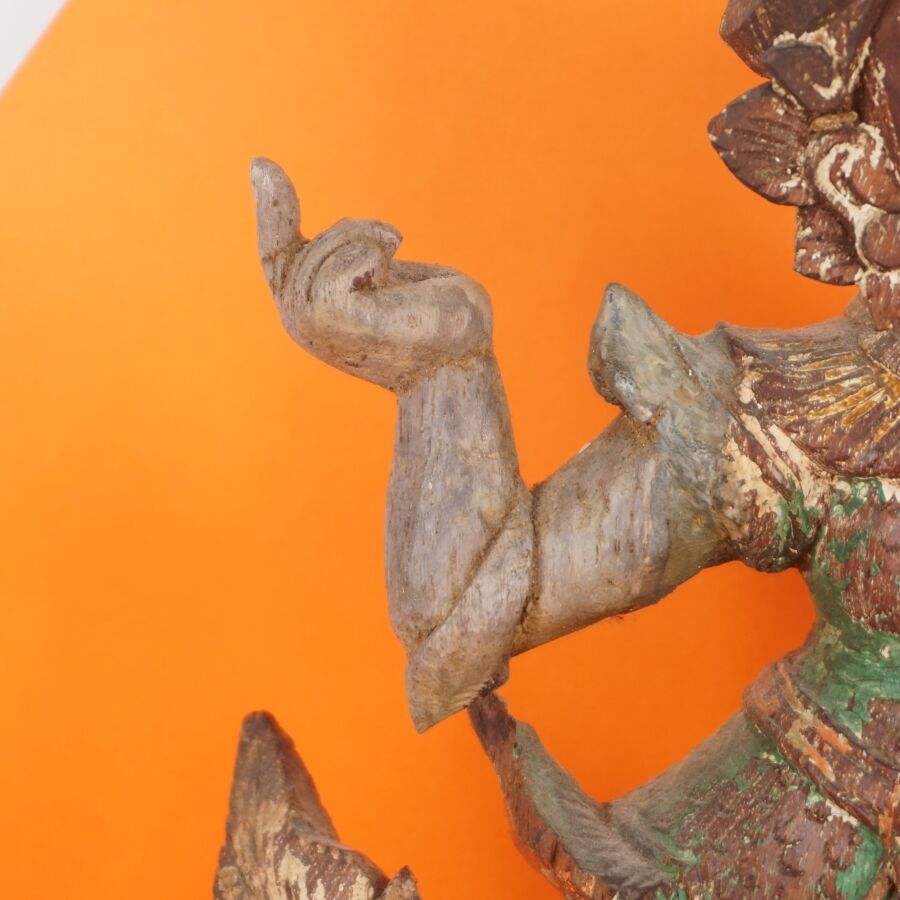 Deux sujets en bois sculpté figurant une danseuse et un Auguste de Jade (manque la lame de Jade), trace de polychromie, Chine et Birmanie, 20ème siècle, H. 25.5 cm et 33 cm (petites usures).
