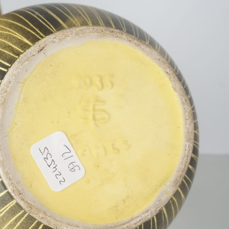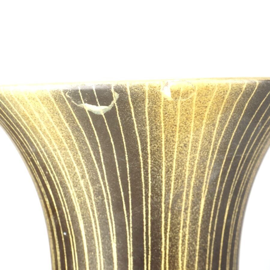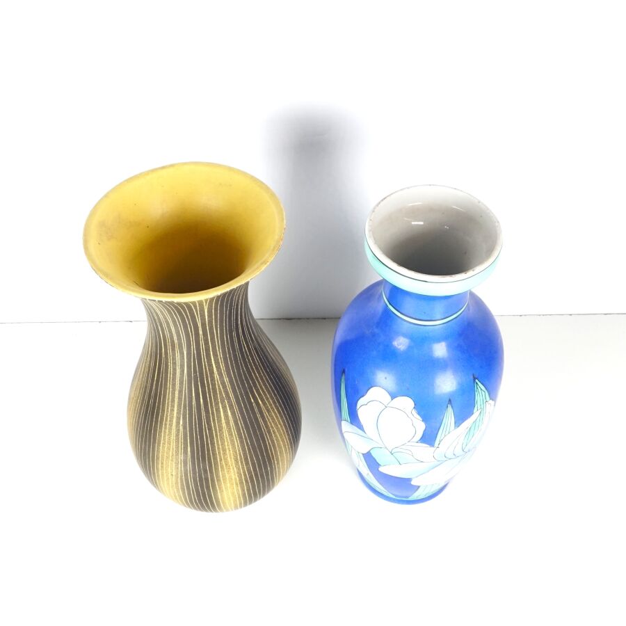 Deux vases de forme balustre en céramique émaillée, l'un à décor de fleurs sur fond bleu, le second à motif rainuré jaune sur fond brun, H. 31.2 cm et 30 cm (petites usures).