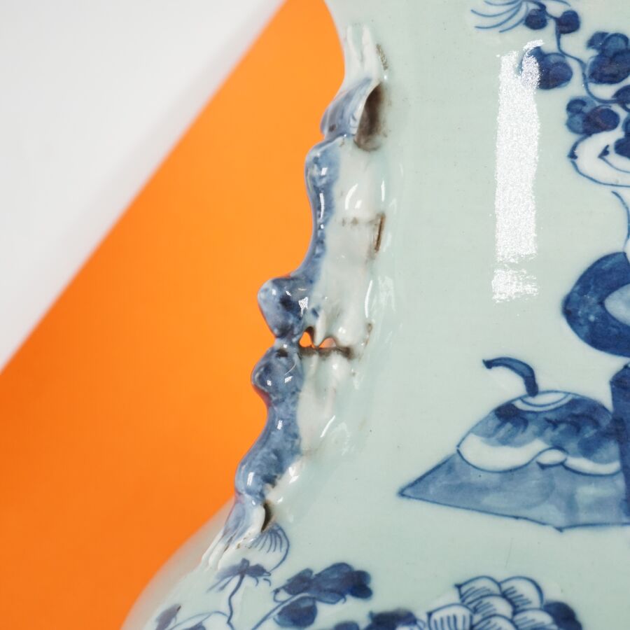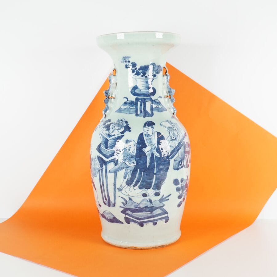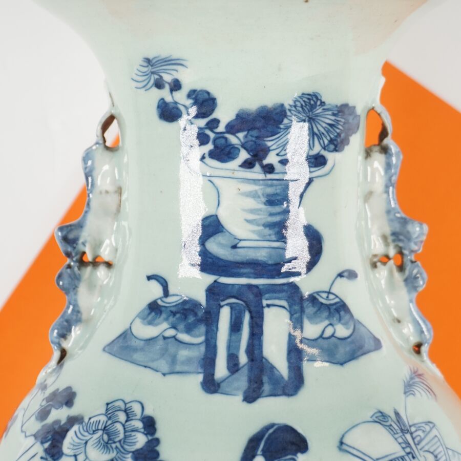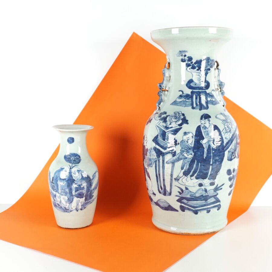 Deux vases de forme balustre, porcelaine émaillée bleu blanc sur fond céladon, l'un à décor d'un dignitaire et d'un enfant entourés d'objets mobiliers (H. 44.5 cm), le second à décor des frères Hoho (H. 23 cm), Chine, fin du 19ème - début du 20ème siècle (fond étoilé sur le grand).