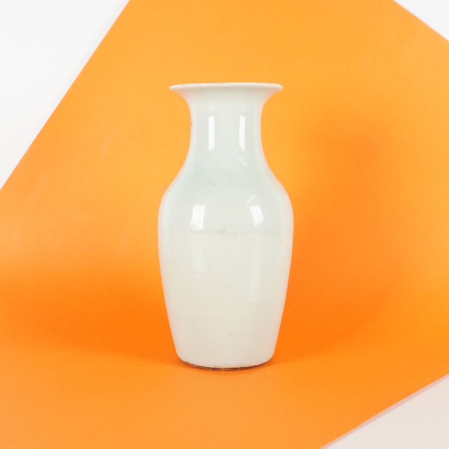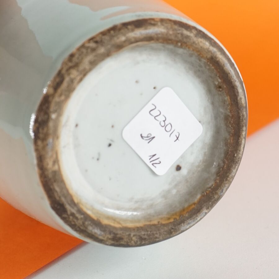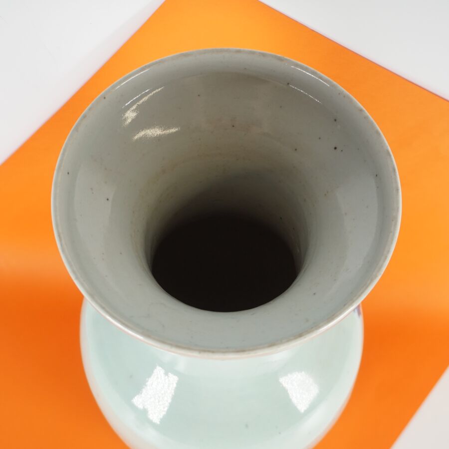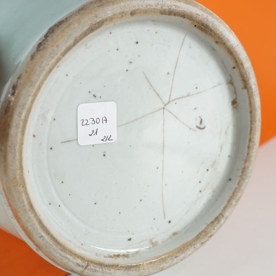 Deux vases de forme balustre, porcelaine émaillée bleu blanc sur fond céladon, l'un à décor d'un dignitaire et d'un enfant entourés d'objets mobiliers (H. 44.5 cm), le second à décor des frères Hoho (H. 23 cm), Chine, fin du 19ème - début du 20ème siècle (fond étoilé sur le grand).