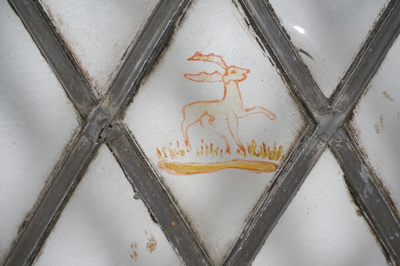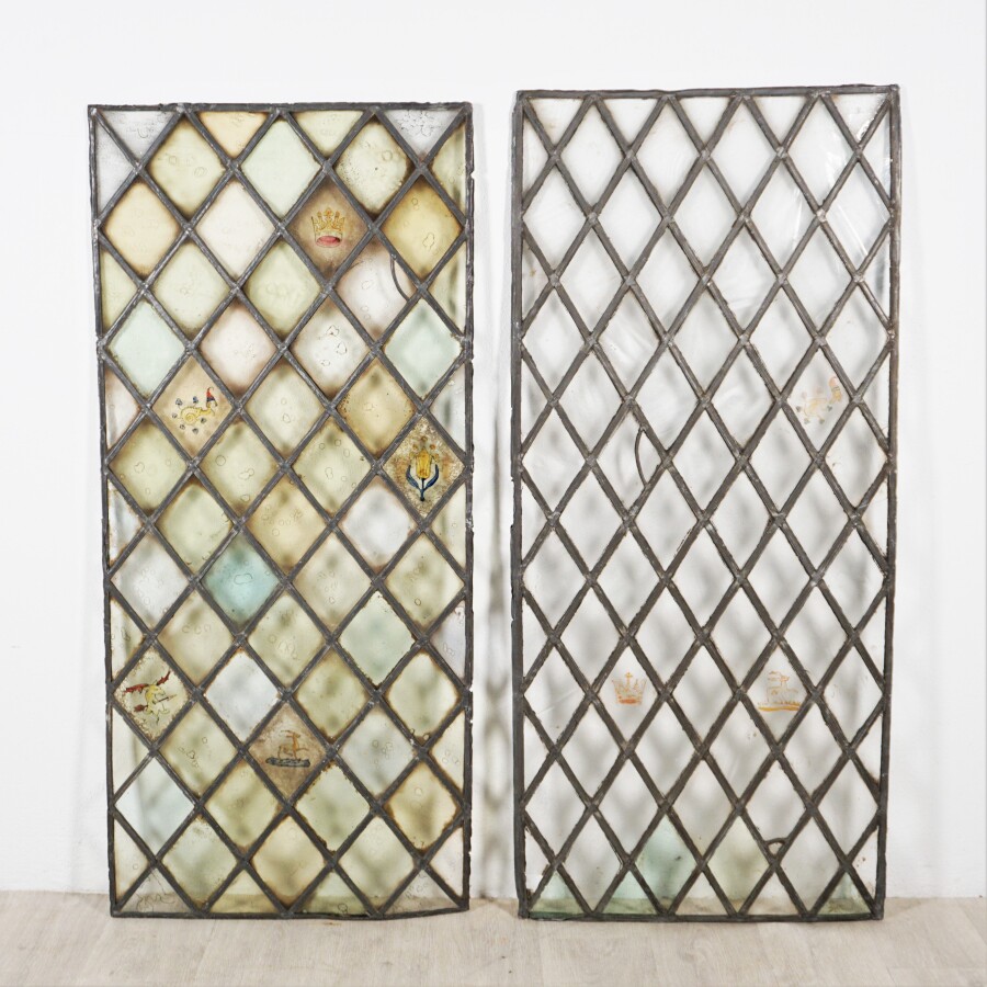 Deux vitraux en verre polychrome, réseau de plomb, à décor de personnages, couronnes et animaux du bestiaire fantastique, H. 124 x 56.5 cm et 126 x 56.7 cm (deux angles abîmés, coin à refixer, fêles, taches).